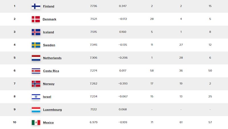 Найщасливішою країною світу автори рейтингу восьмий рік поспіль називають Фінляндію. За нею розташувалися Данія, Ісландія, Швеція, Нідерланди, Коста-Рика, Норвегія, Ізраїль та Люксембург. Замикає першу десятку Мексика, яка потрапила до неї вперше.