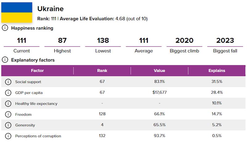Порівняно з 2023 роком, наша країна опустилася на шість позицій — тоді вона посідала 105 місце. Найщасливішими українці були у 2012 році (87 місце), а найнещаснішими — у 2017 (138 місце).