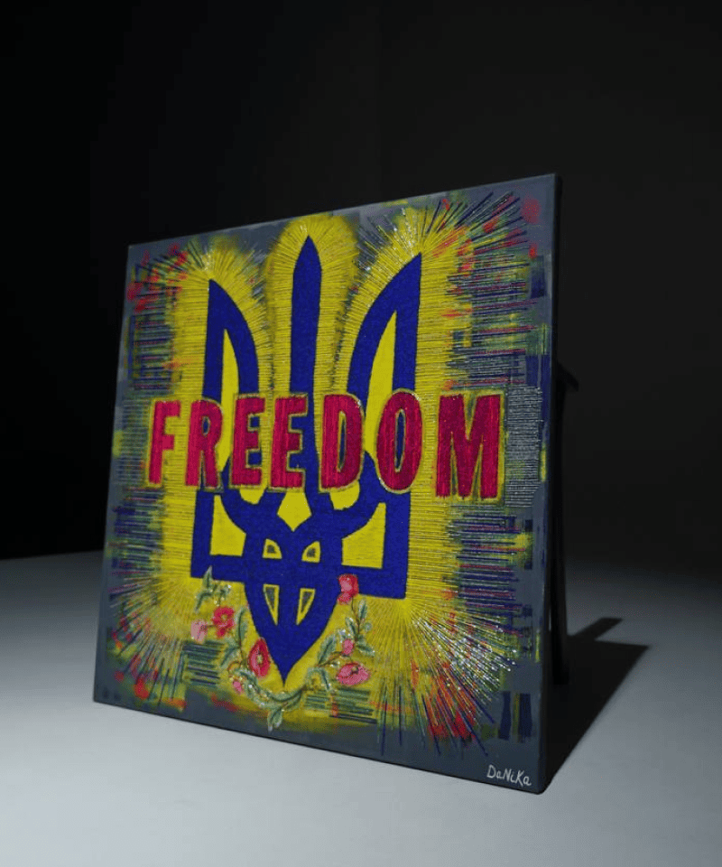 Картина виконана повністю вручну у складній авторській техніці вишивки з використанням бісеру та змішаних матеріалів.