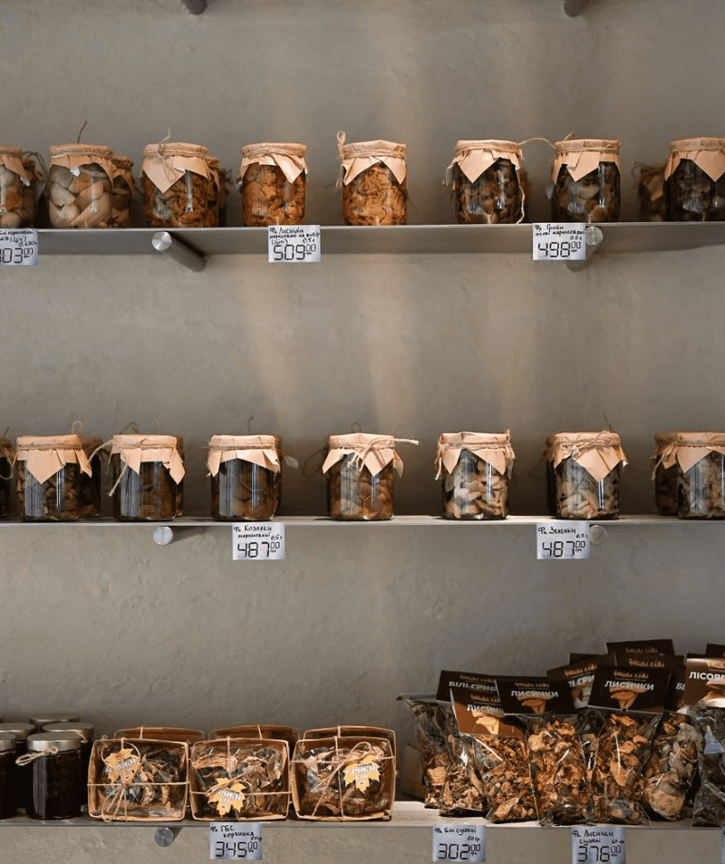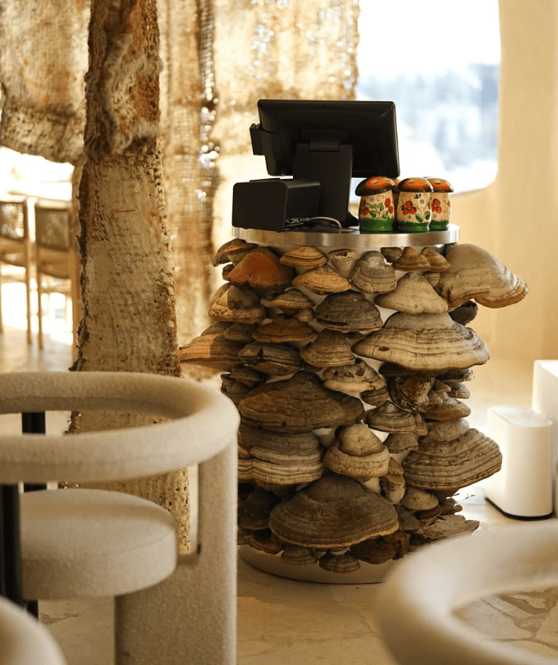 Інтер'єр ресторану "Грибова хата" розробила українська студія YOD Group. А головним елементом, який привернув увагу Dezeen, стало інноваційне використання біоматеріалів. Там встановлені органічні ширми та меблі, які буквально "виростила" з грибного міцелію біодизайнерка Даша Цапенко, а також округлі, грибоподібні форми та пастельні відтінки, аби підкреслити природний концепт.