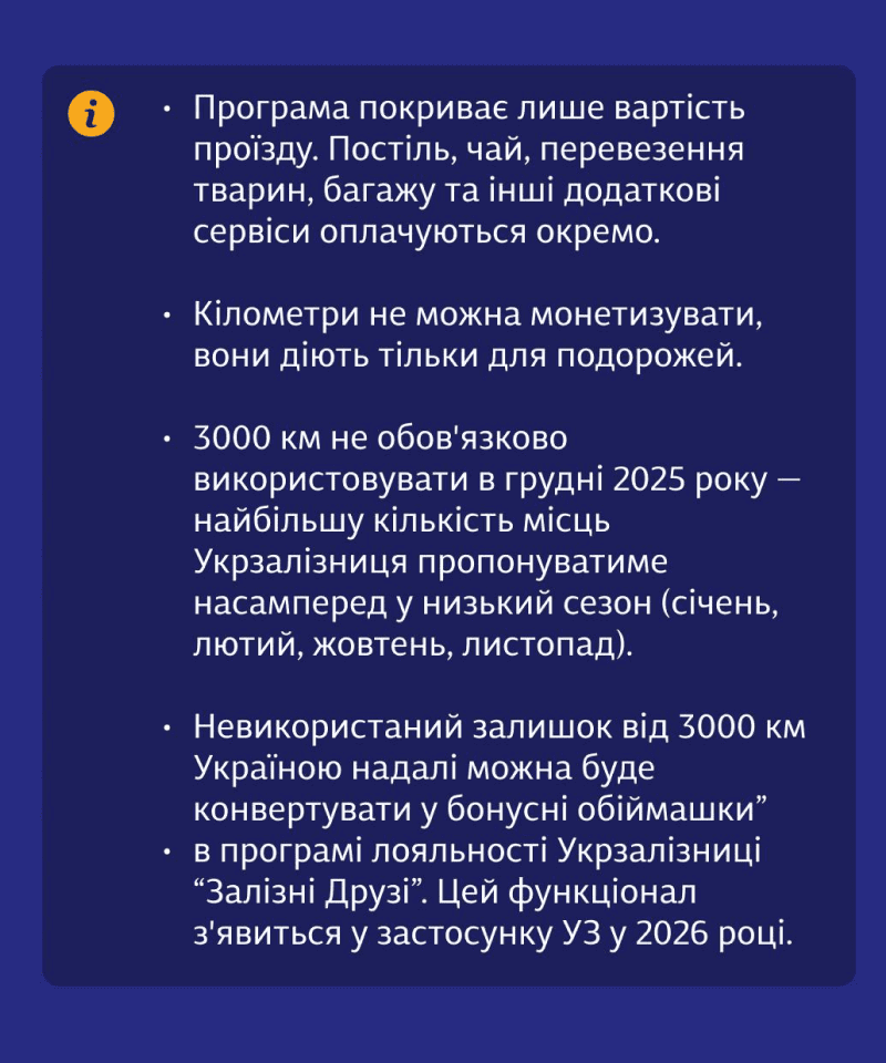 Кілометри автоматично спишуться з бонусного рахунку. Оформити такі квитки можна вже відсьогодні, 3 грудня, а вирушити в подорож — з п'ятниці, 5 грудня. Загалом для одного пасажира будуть доступні до чотирьох поїздок загальною відстанню 3000 км, якими можна буде скористатися до кінця 2026 року.