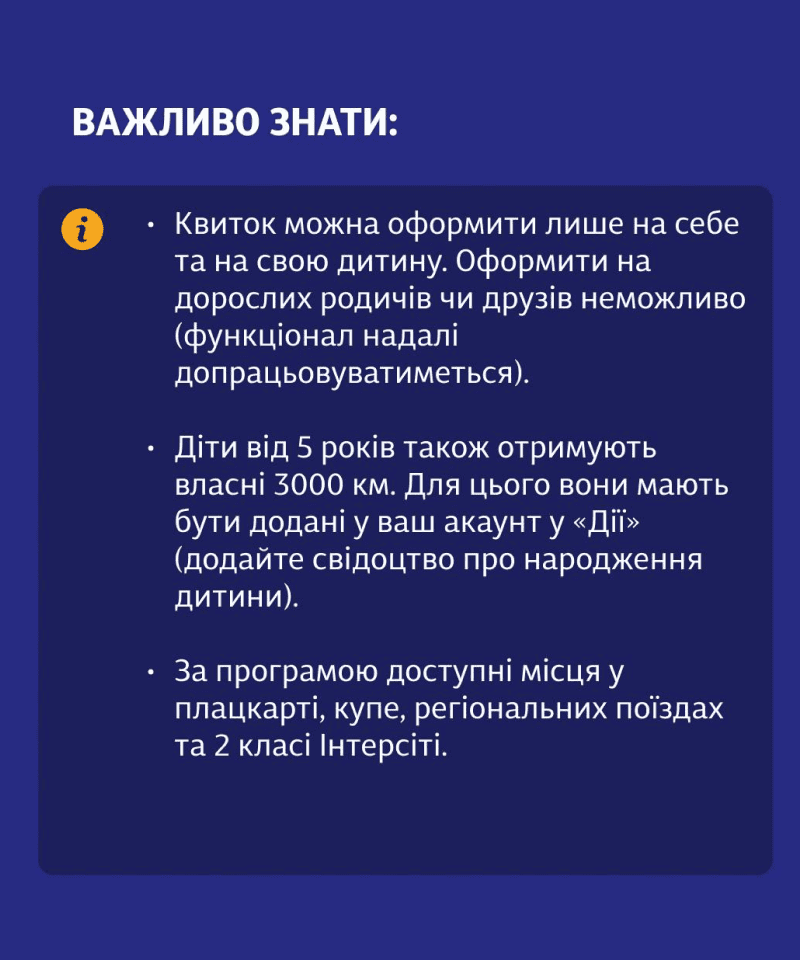 Програма передбачає використання 3000 км поїздок залізницею у непікові періоди, коли є вільні місця. Вони будуть доступні у плацкарті, купе, регіональних поїздах та другому класі "Інтерсіті".