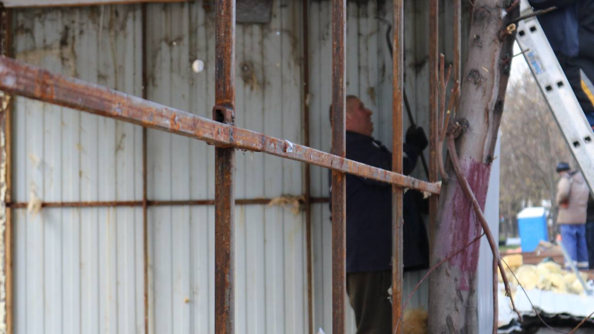 Під час демонтаж МАФів комунальники показали, з чого вони насправді зроблені: іржаві труби, старі склопакети, сухі дошки, плівка, що місцями слугує дахом та ізоляцією, а також гниле ДСП і старий залізний шифер.