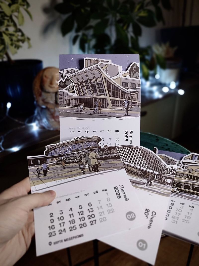 Кожен місяць на цих календарях відкриває відому модерністську будівлю Києва або Харкова.