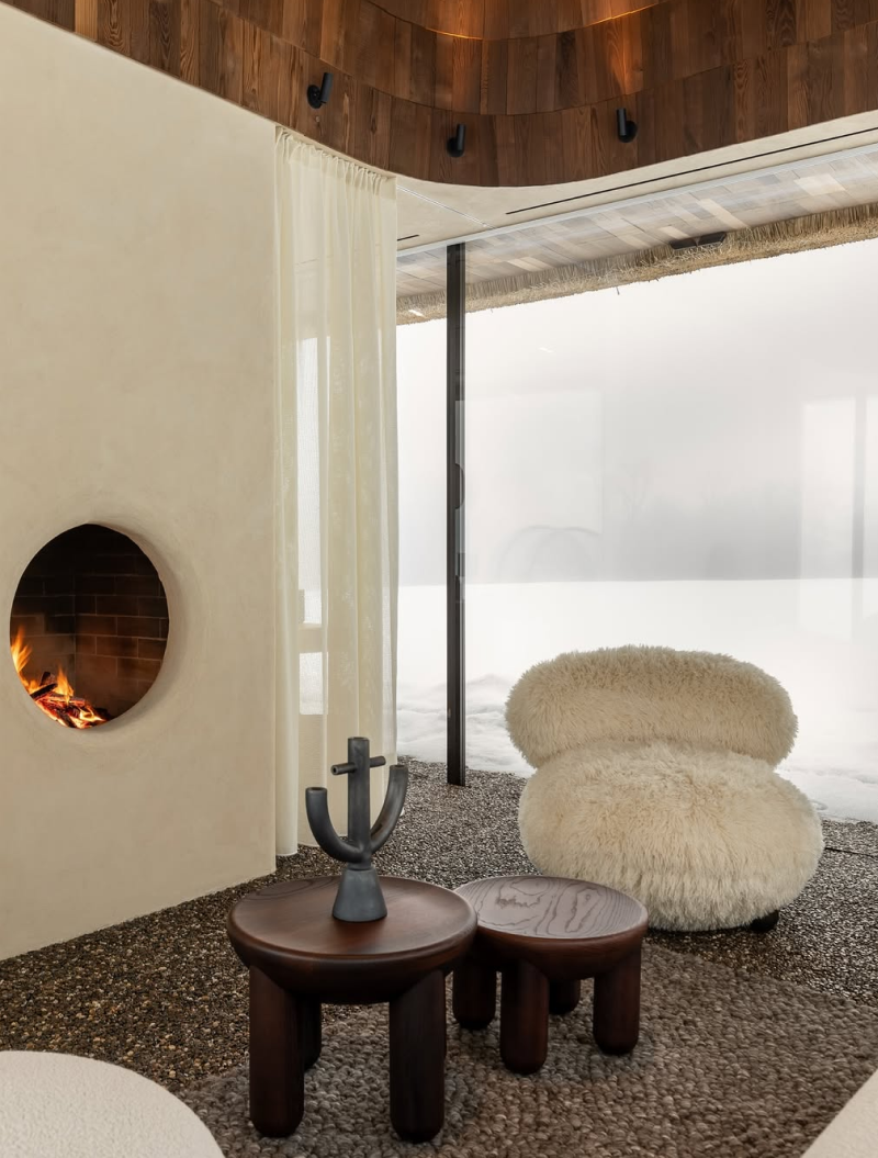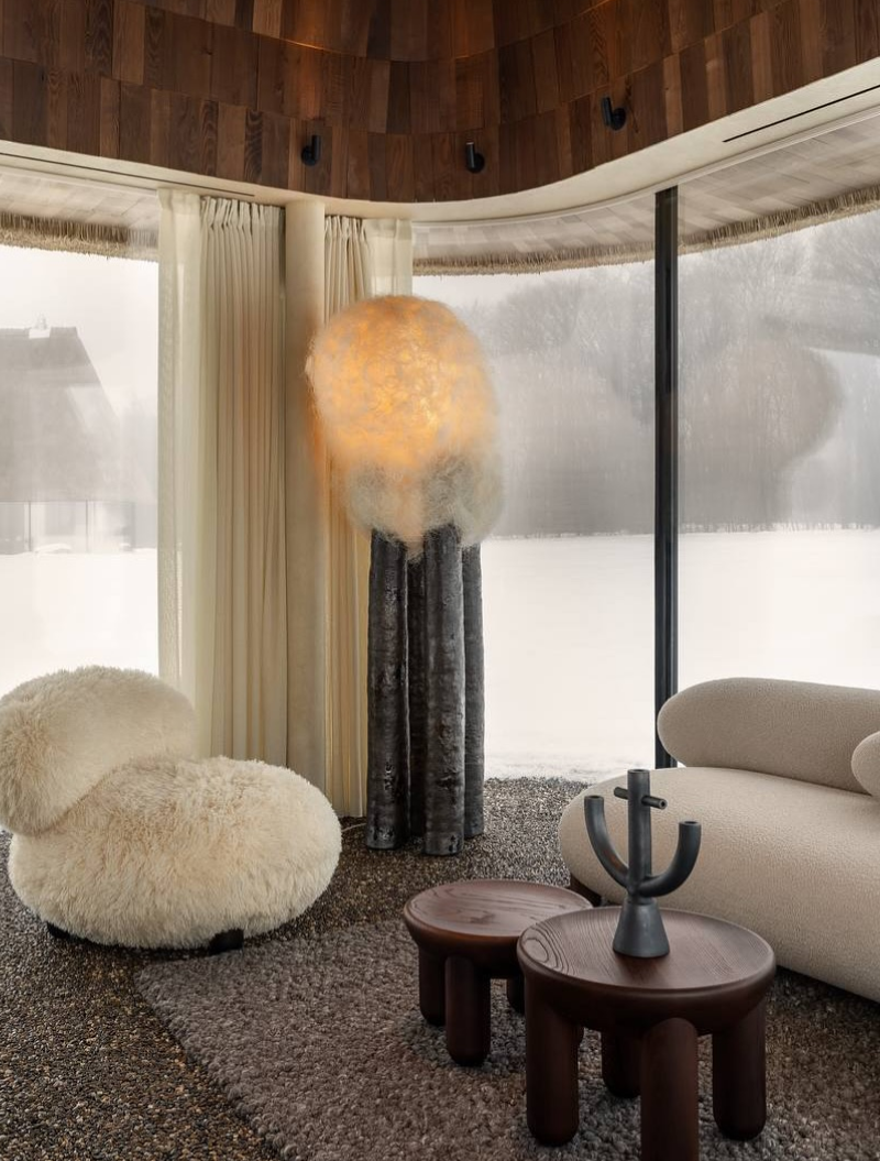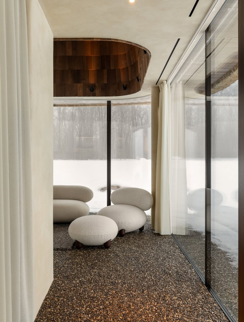 У вітальні облаштували мінімалістичний камін замість традиційної печі, а також відмовилися від телевізора, аби гості змогли емоційно відновитися. Комфортний мікроклімат у приміщенні забезпечують теплові насоси. Також є прихована система кондиціонування.
