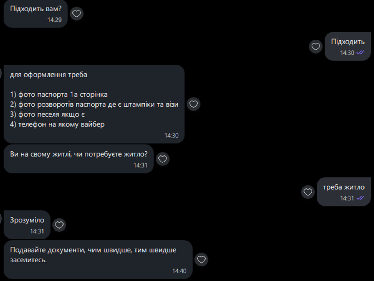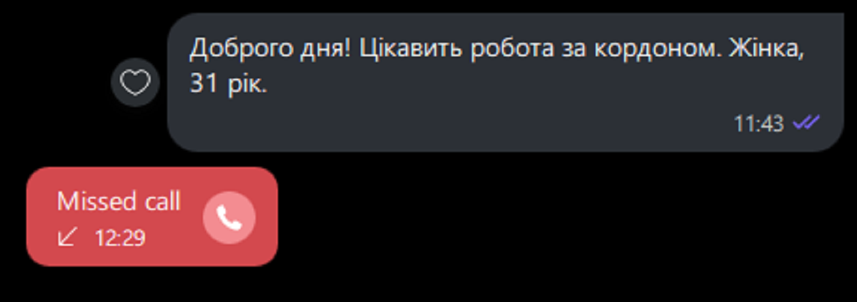 Зазвичай вербувальники ігнорують прямий діалог із зацікавленими кандидатами у соцмережах, закликаючи продовжити розмову в месенджерах для обговорення деталей роботи.