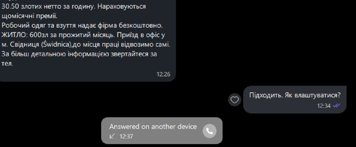 Ми зв'язалися із декількома потенційно небезпечними роботодавцями, які публікували оголошення у Facebook та лишали свій контакт для зв'язку у Viber. Спілкування з маніпуляторами відбувалося за майже однаковим сценарієм.