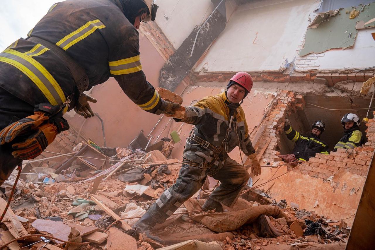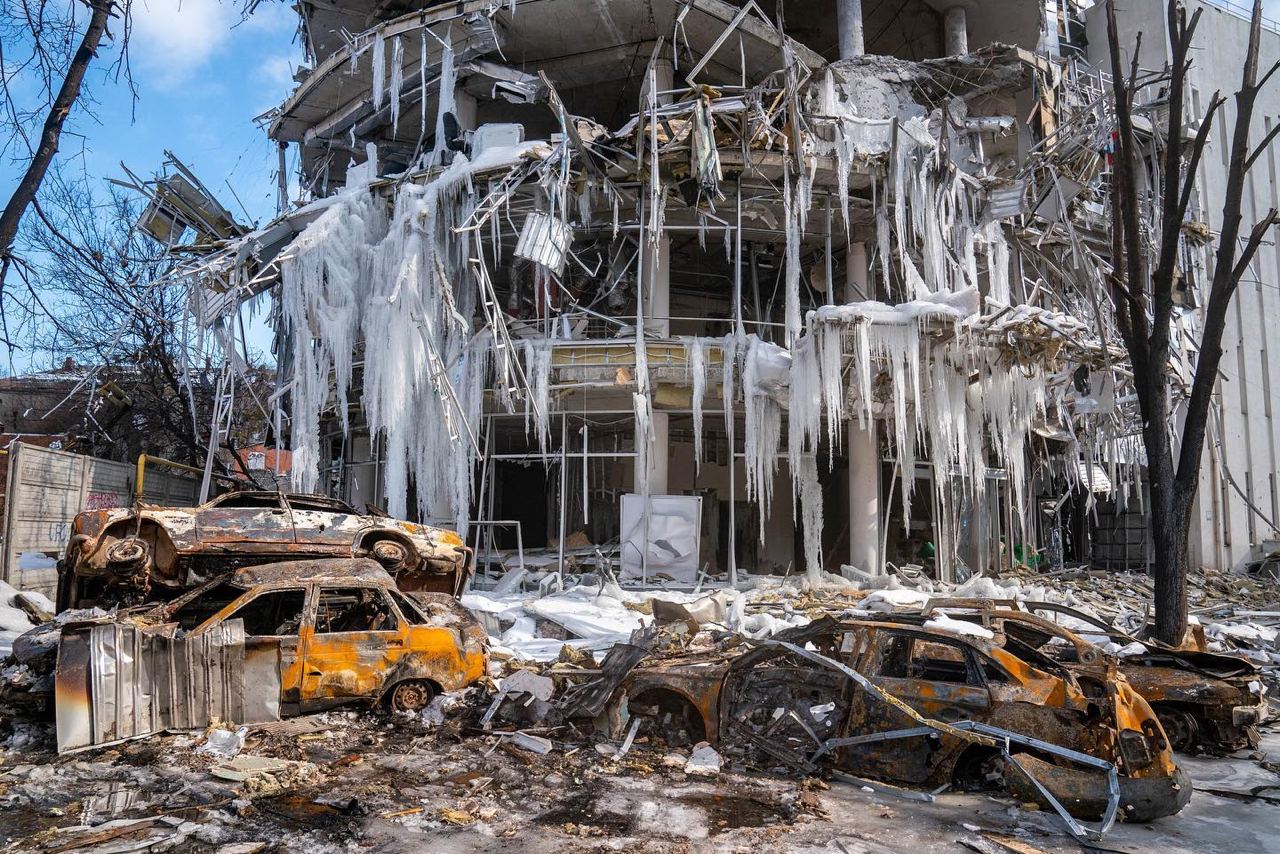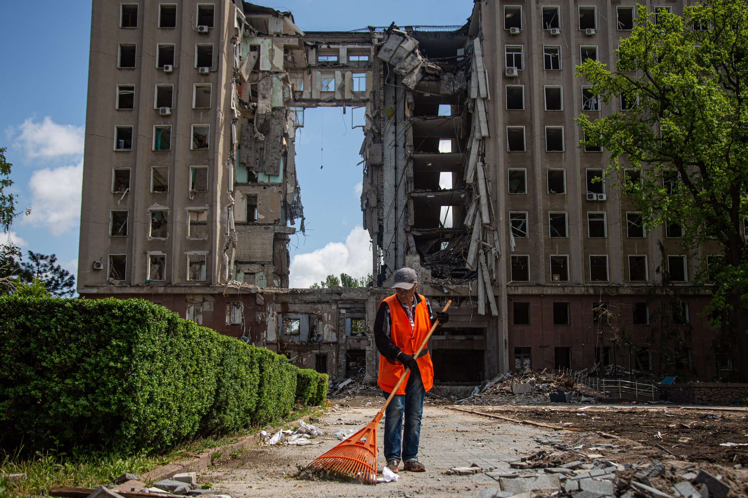 Photo by Jack Losh / A cleaner sweeps up debris outside Mykolaiv's ruined regional government headquarters, hit by a Russian missile in March 2022