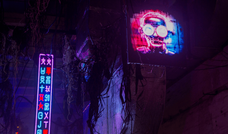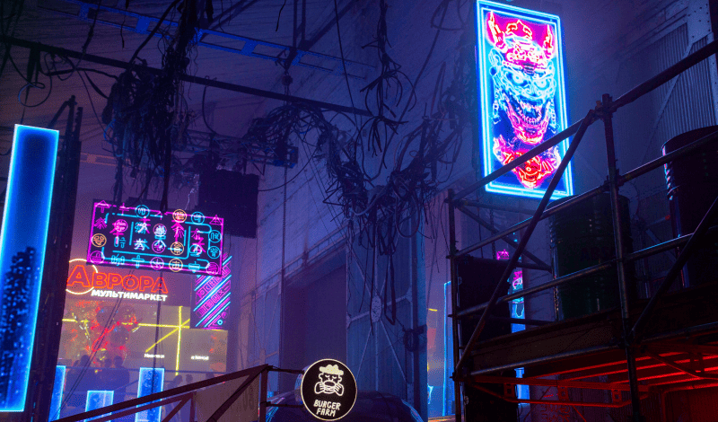 Великі й малі світлодіодні вивіски та екрани, навіть супермаркет і фудкорт майбутнього, безліч звисаючих проводів та інших футуристичних артефактів створювали відчуття кіберреальності.