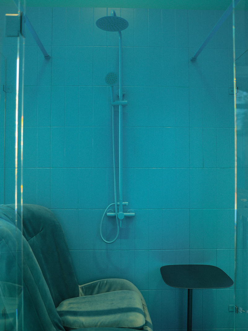 Для охочих усамітнитися для важливого дзвінка — тут облаштували душову. Хоч і без потоку води, та дизайнерське рішення цікаве!