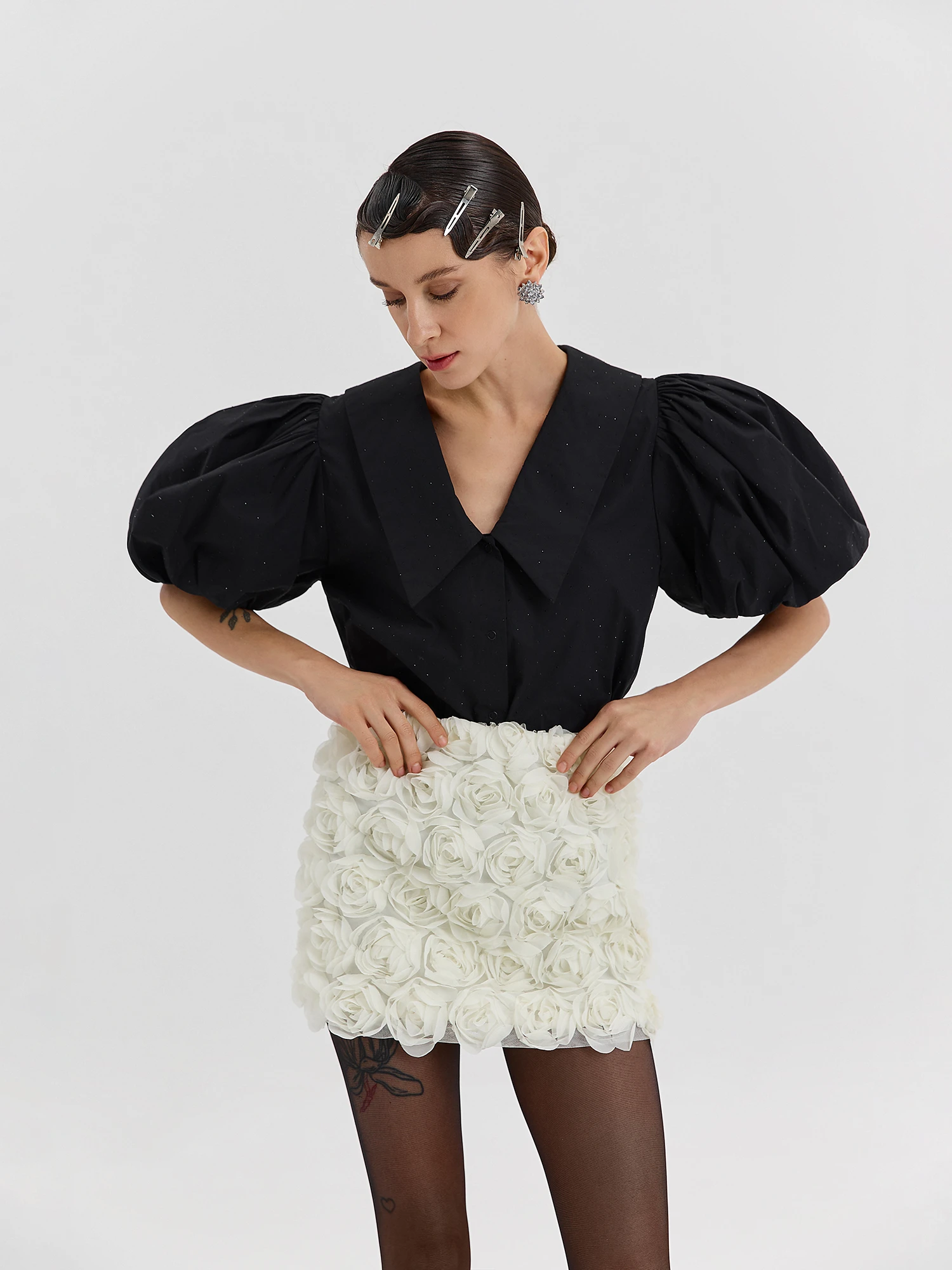 Наповнення новорічної колекції "Мерехтлива" від diadia повністю відповідає її назві. Дроп включає сукні, повністю всипані лелітками, речі з металевим блиском, а також оксамитові позиції та знакові романтичні спідниці, декоровані 3D-трояндами.