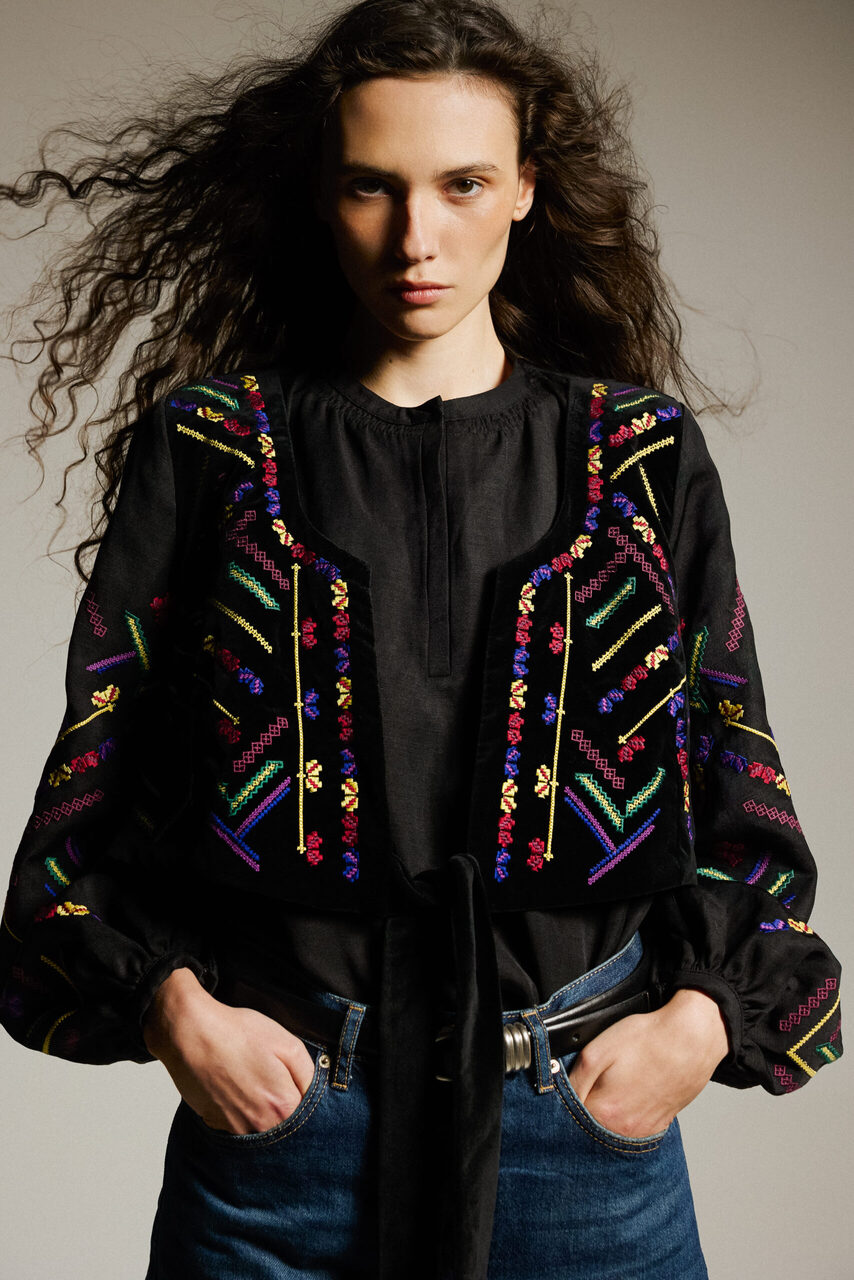 До колекції увійшли вишиті сорочки з натурального льону у молочно-білому кольорі з білою або чорною вишивкою, чорна лляна сорочка з кептарем та різноколірною вишивкою, а також чорна віскозна вишита сукня та світлий кептар із вовни.