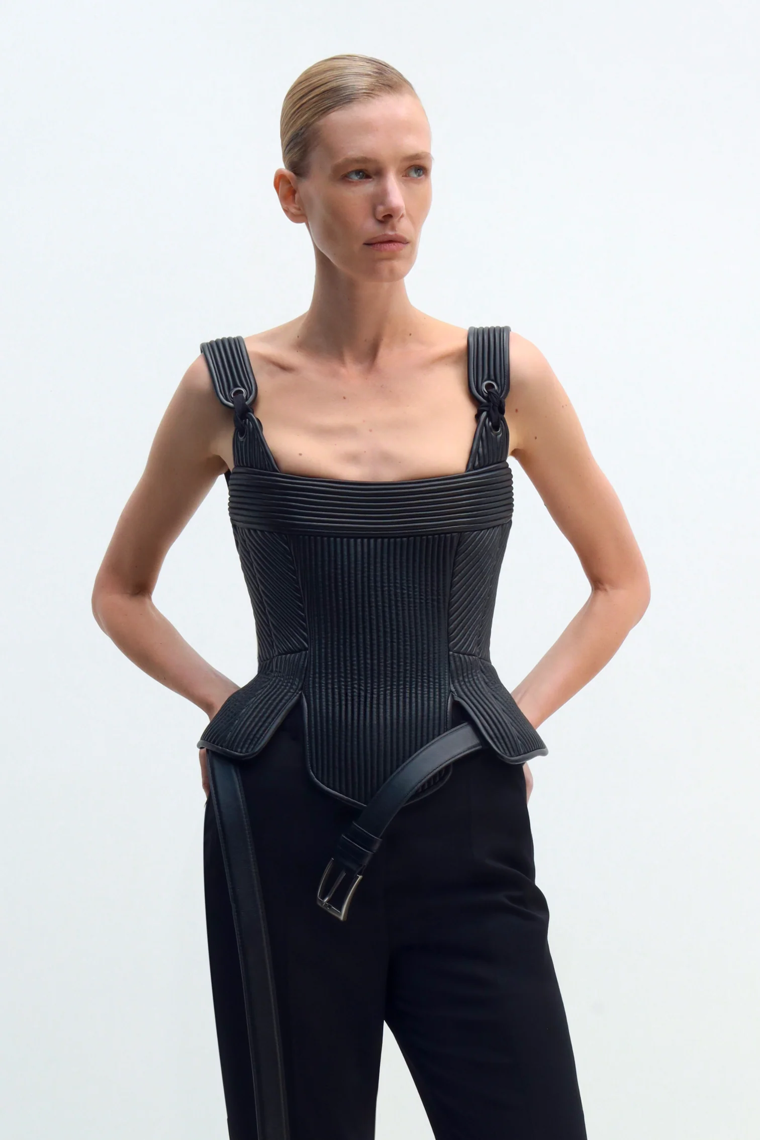 Речі з капсули MIDNIGHT GALA від GUDU стануть основою ефектного образу. Більшість із них виконана у чорному кольорі: це авангардні сукні з пишним "бульбашковим" або каскадним асиметричним низом, рубчасте шкіряне бюст'є ручної роботи й піджак із гіперболізованими плечима. Капсулу доповнюють сріблясті сукні з лелітками — одна з бічним вирізом на талії, інша — з довгим передом та укорочена ззаду.