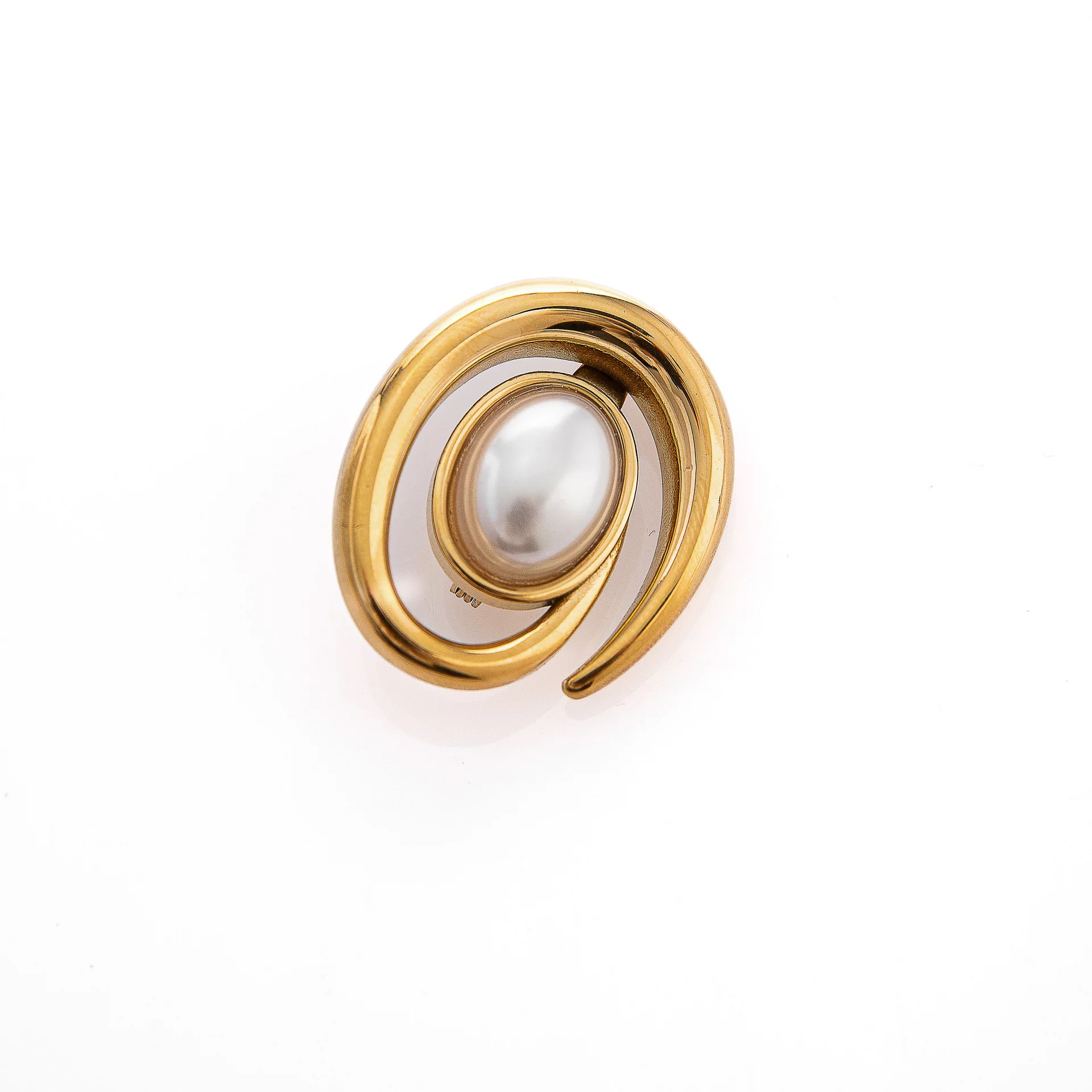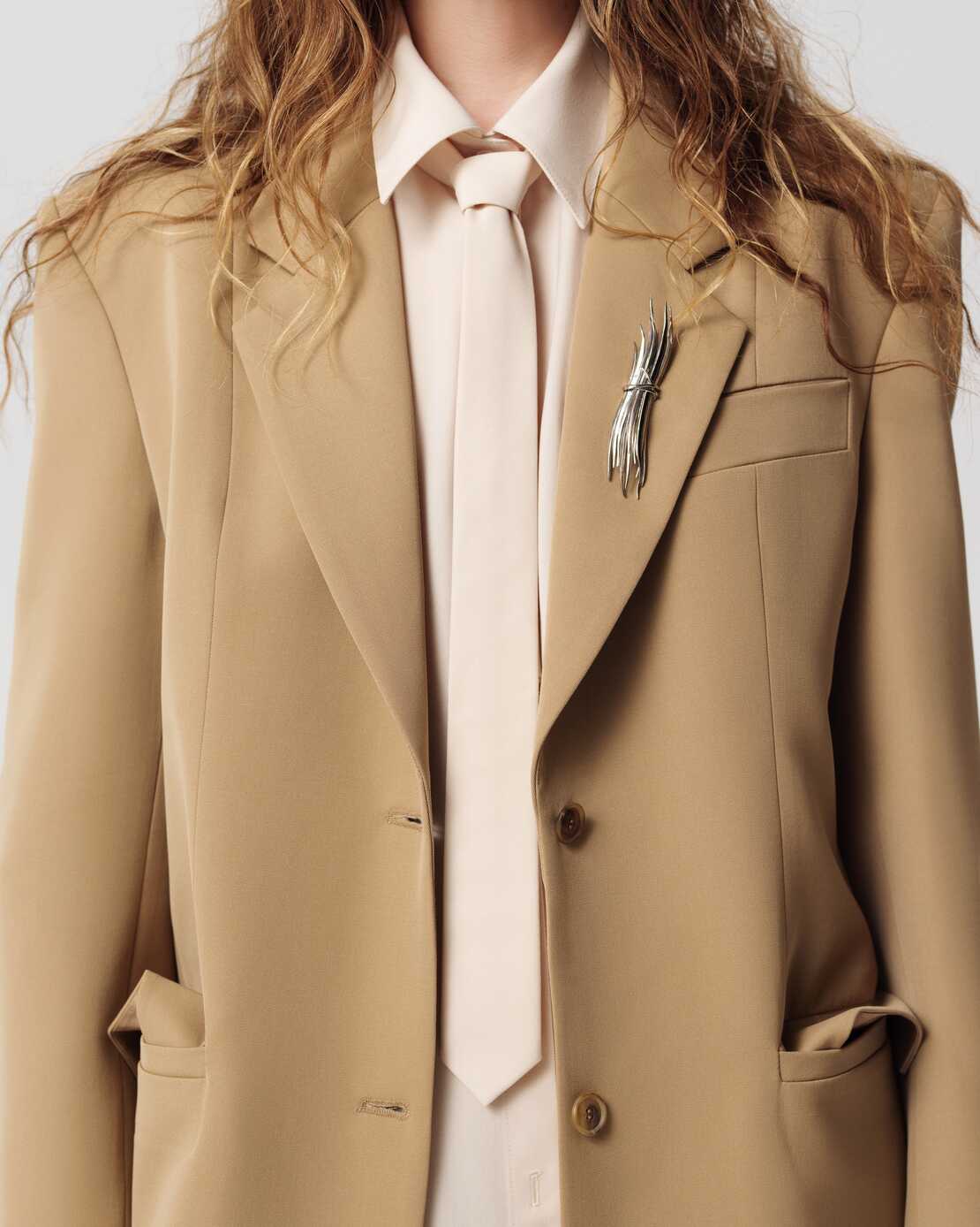 У Gepur можна знайти простий овальний варіант у золотистому кольорі. А мінімалістичні брошки, виготовлені із латуні з позолотою, представлені в KATIMO та DAFF. Перший бренд створив оздобу у формі дверної ручки, а другий — прикрасу ручної роботи у вигляді тонкої трубочки.