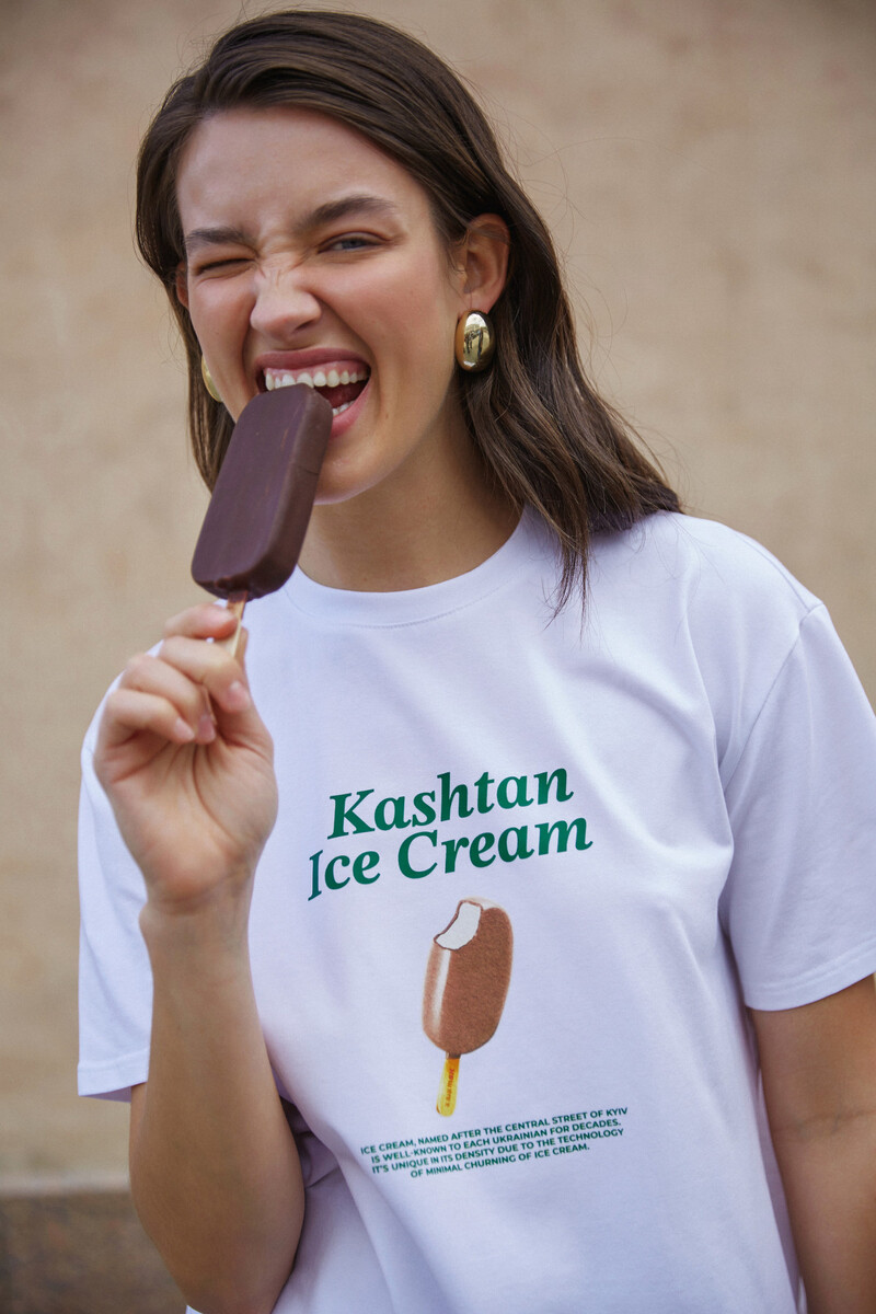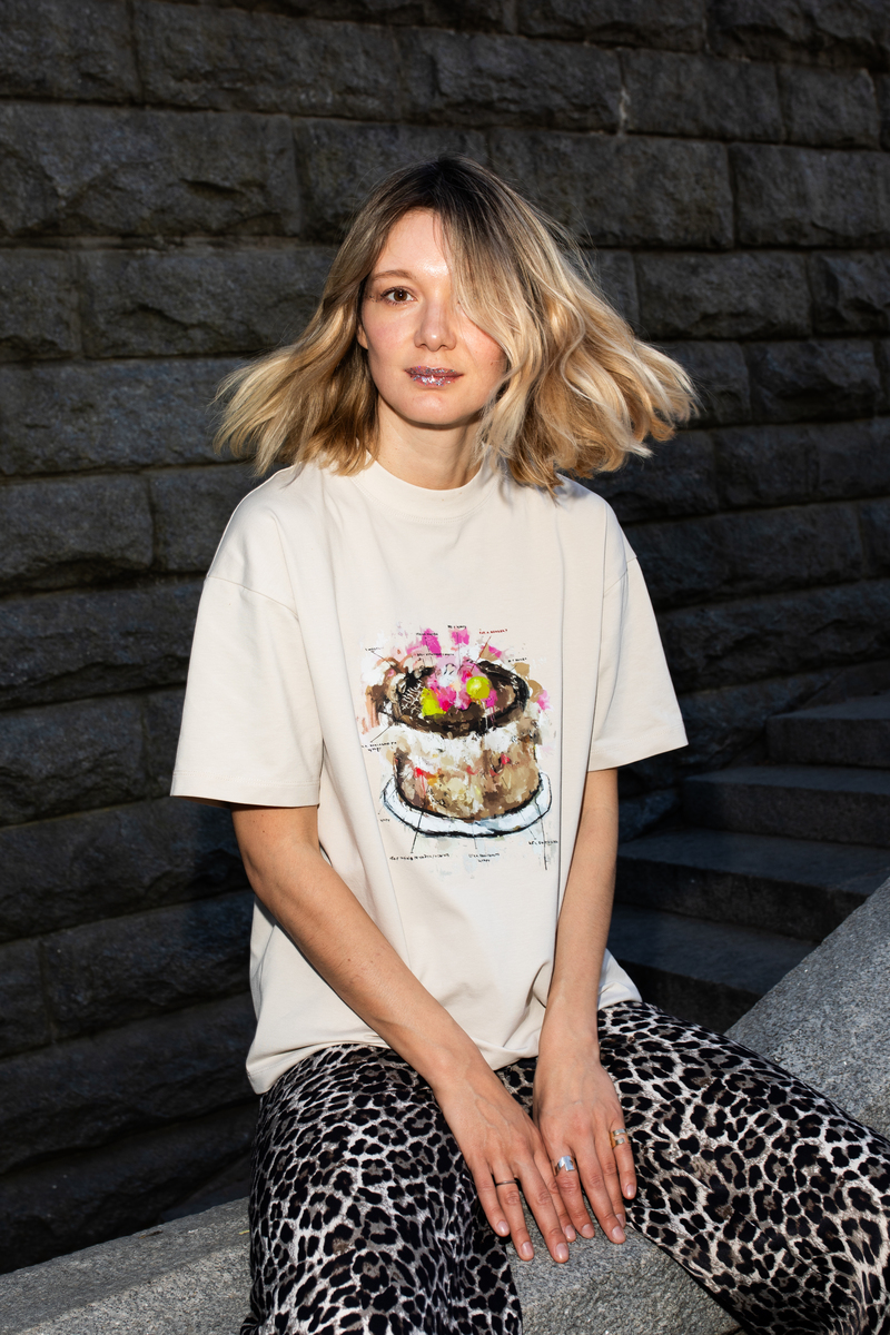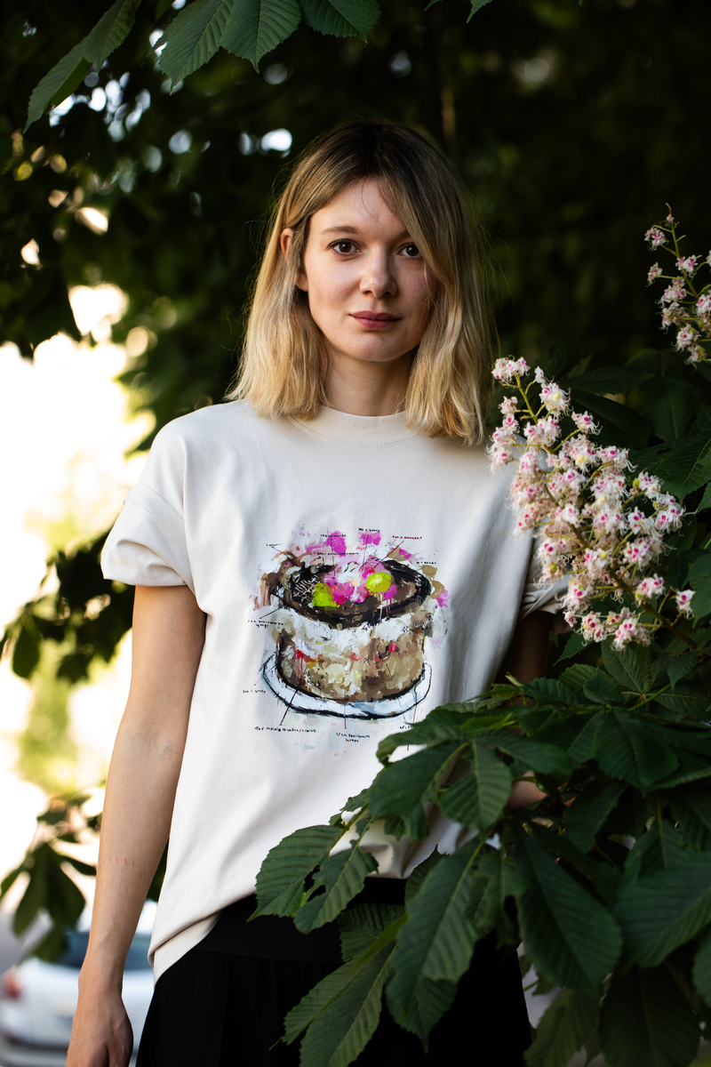 Мисткиня Юлія Пекер-Моховікова, яка свої роботи грайливо називає казковим неоекспресіонізмом, об'єдналася з брендом Vika Adamska, аби перенести свою картину з солодким символом столиці — київським тортом — на стильну футболку. Команда ділиться ідеальним fashion рецептом: носити футболку можна зі штанами вільного крою чи літнім денімом.