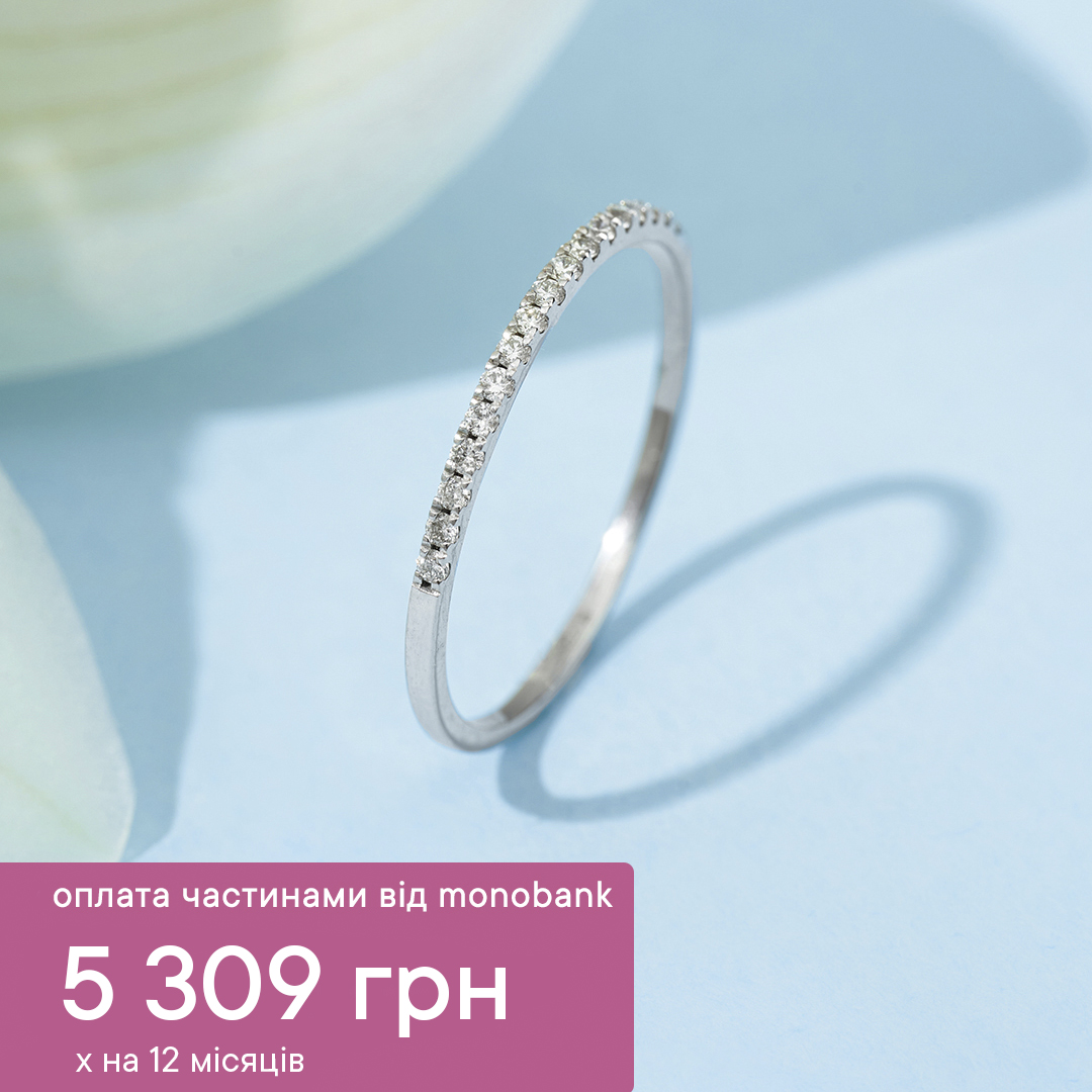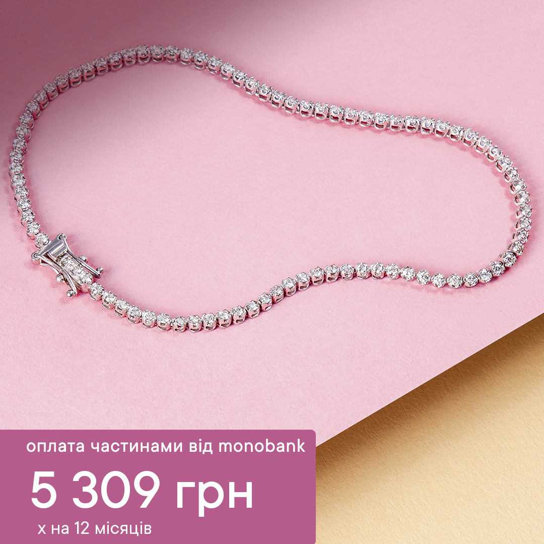 Наприклад, купуй каблучку з доріжкою діамантів за 1445 гривень або тенісний браслет з діамантами за 5309 гривень на 12 платежів. Насолоджуйся прикрасою вже зараз і не думай про оплату.