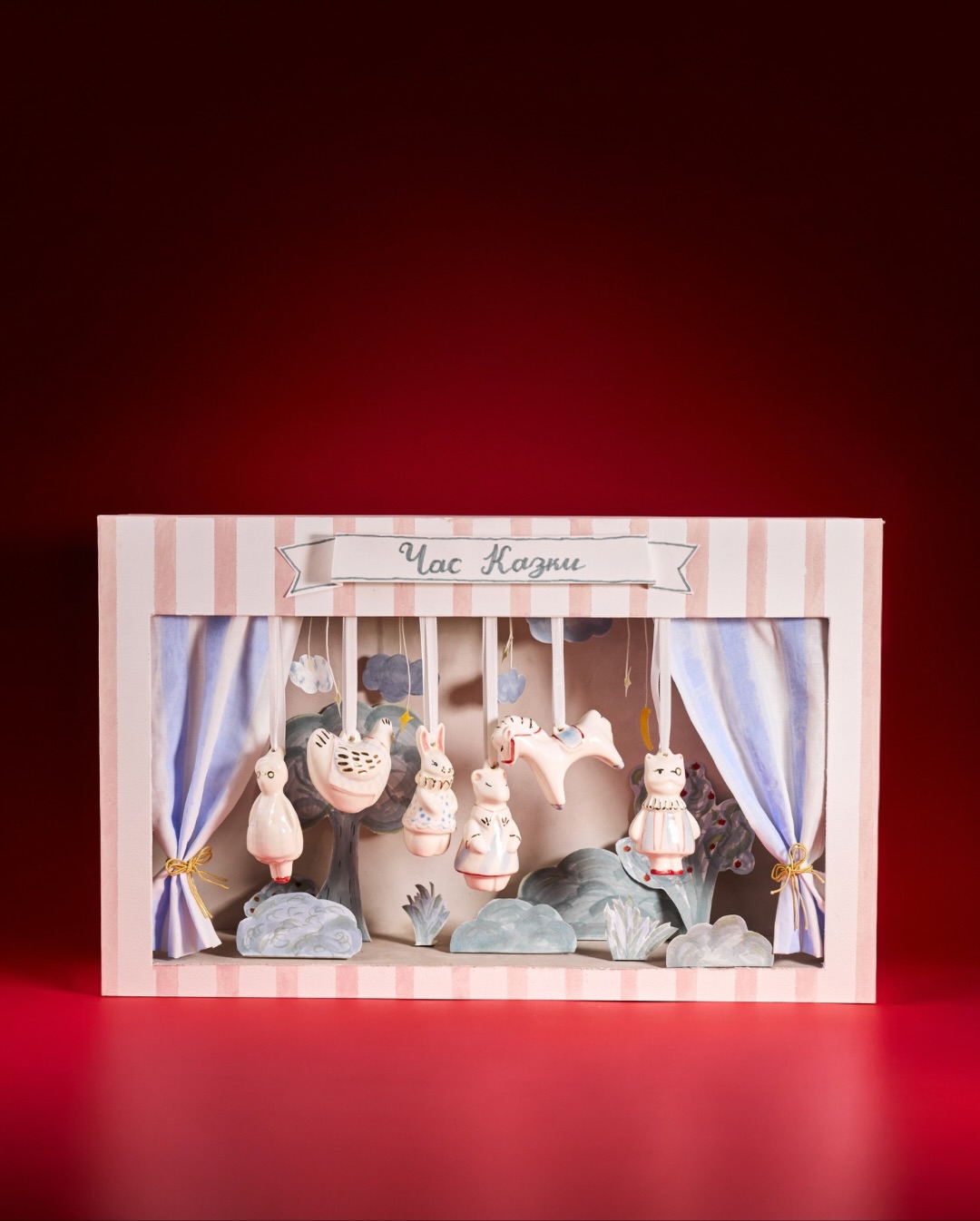У ній, окрім тарілок і свічника в ніжних відтінках із ручним розписом, можна знайти керамічні ялинкові іграшки "Пан Коцький", "Курочка Ряба", "Зайчик-Пострибайчик" та інші.