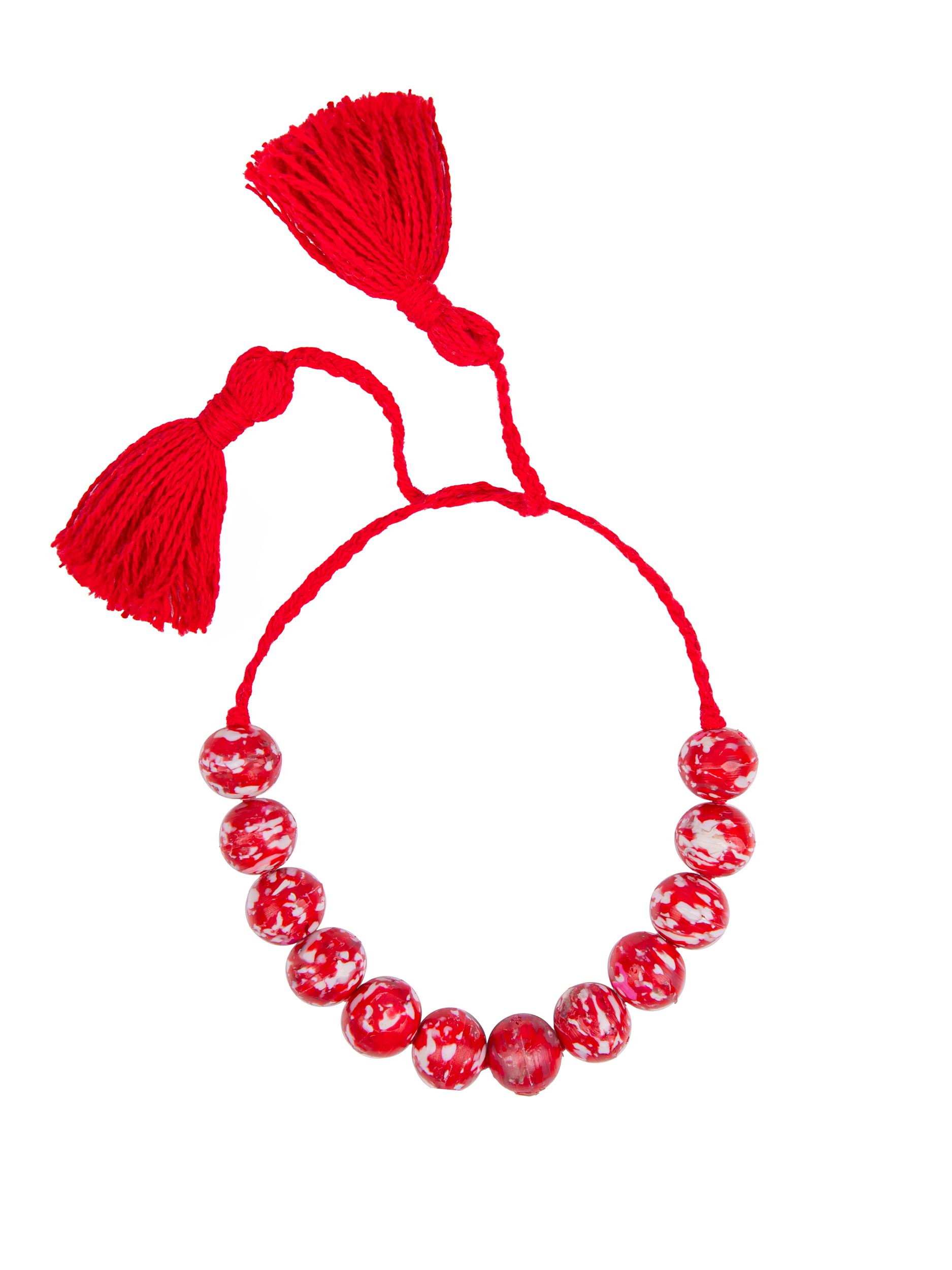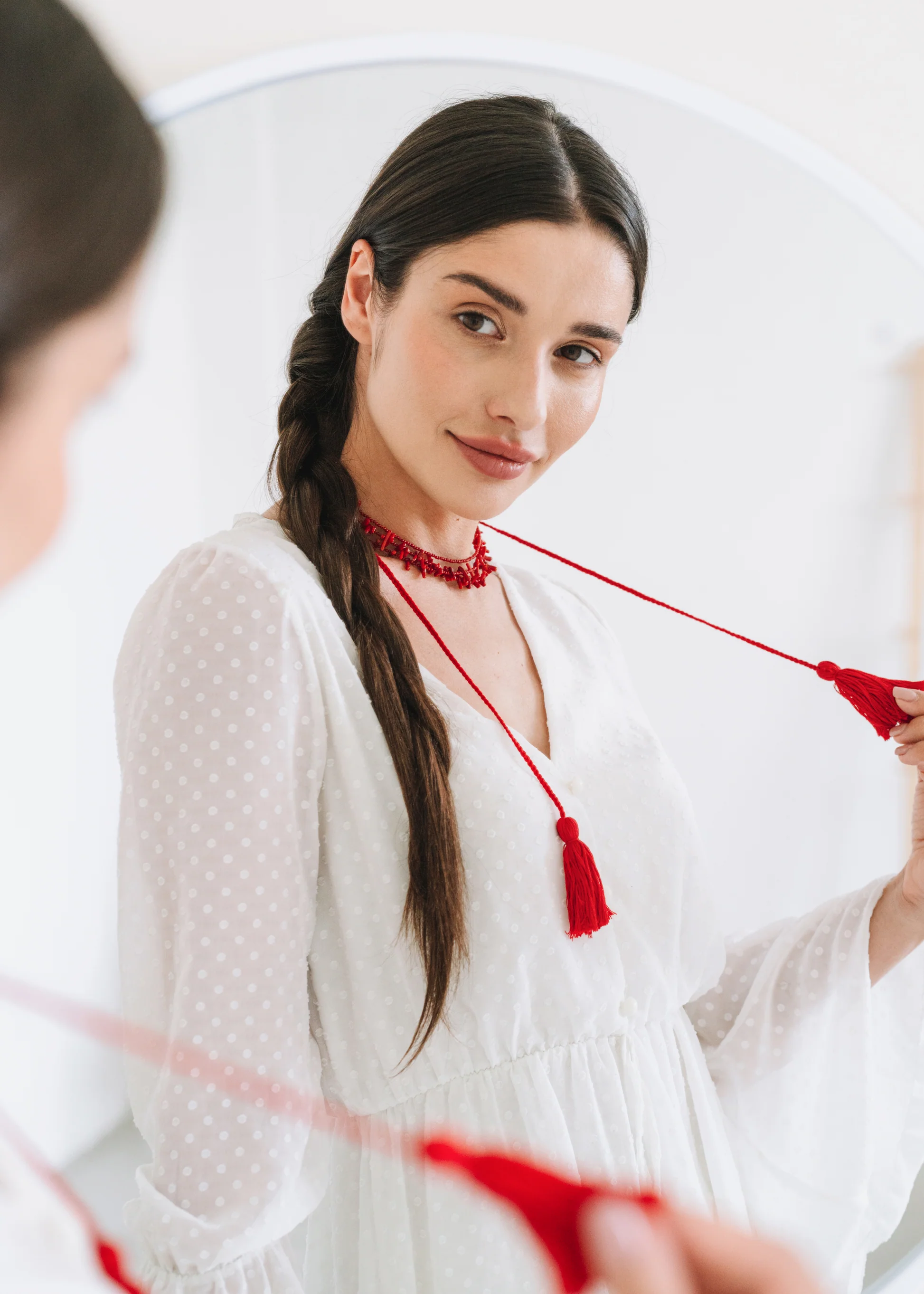 Ще кілька українських марок переосмислили традиційне намисто — коралі. Бренд "Ні грама драми" виконав цю прикрасу в сучасному прочитанні — з натуральних коралових намистин, доповнену знімними китицями.