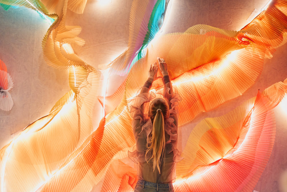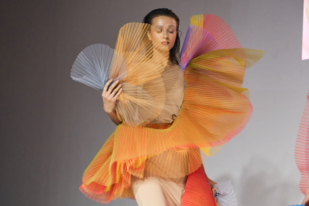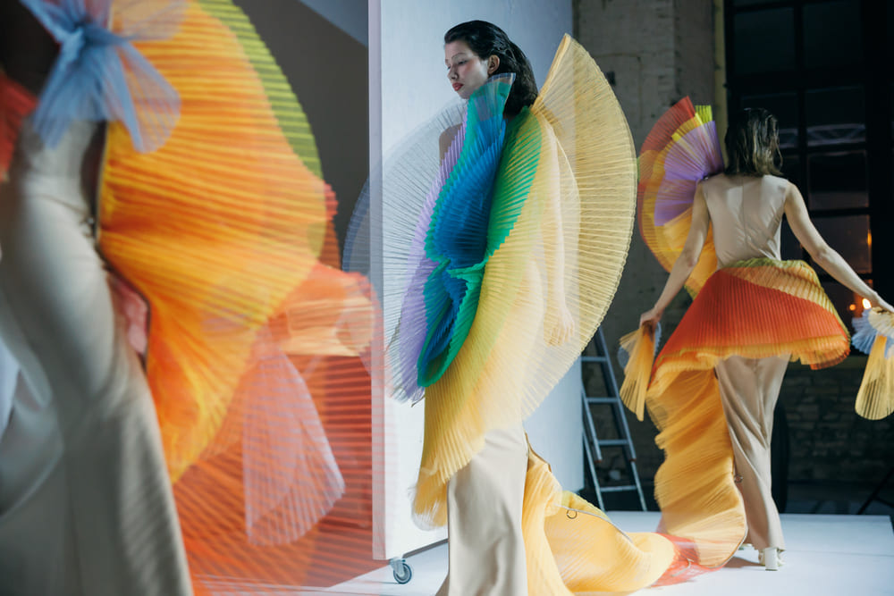 Під час артперформансу дизайнерка переносила частини барвистих суконь, які демонстрували моделі, на полотно. Це був трансформаційний процес повного кола: від мистецтва до моди й назад до мистецтва.