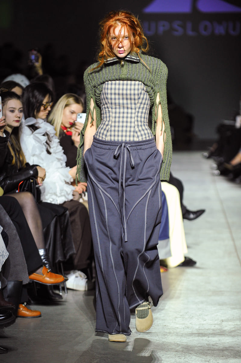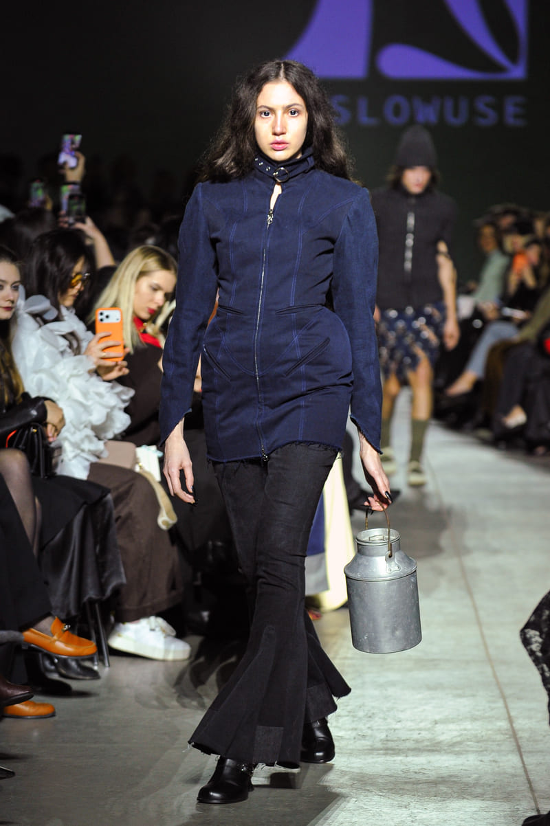 Показ UPSLOWUSE пройшов у театральному форматі. На подіум виходили моделі, які, здавалося, уособлювали різні міфічні образи — грізні, загадкові та загрозливо чарівливі. Їхній одяг — апсайкл-вироби з деніму та вручну в’язані речі з переробленої шерсті — є продовженням вже впізнаваної естетики UPSLOWUSE та мав на меті передати характер цих міфічних персонажів.