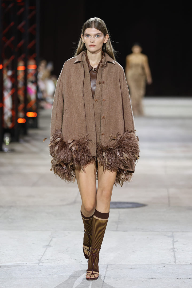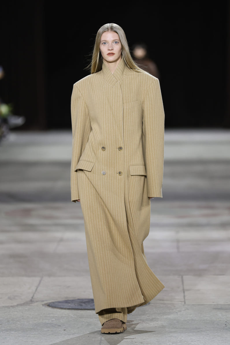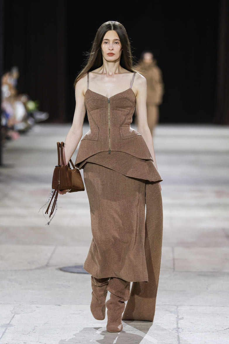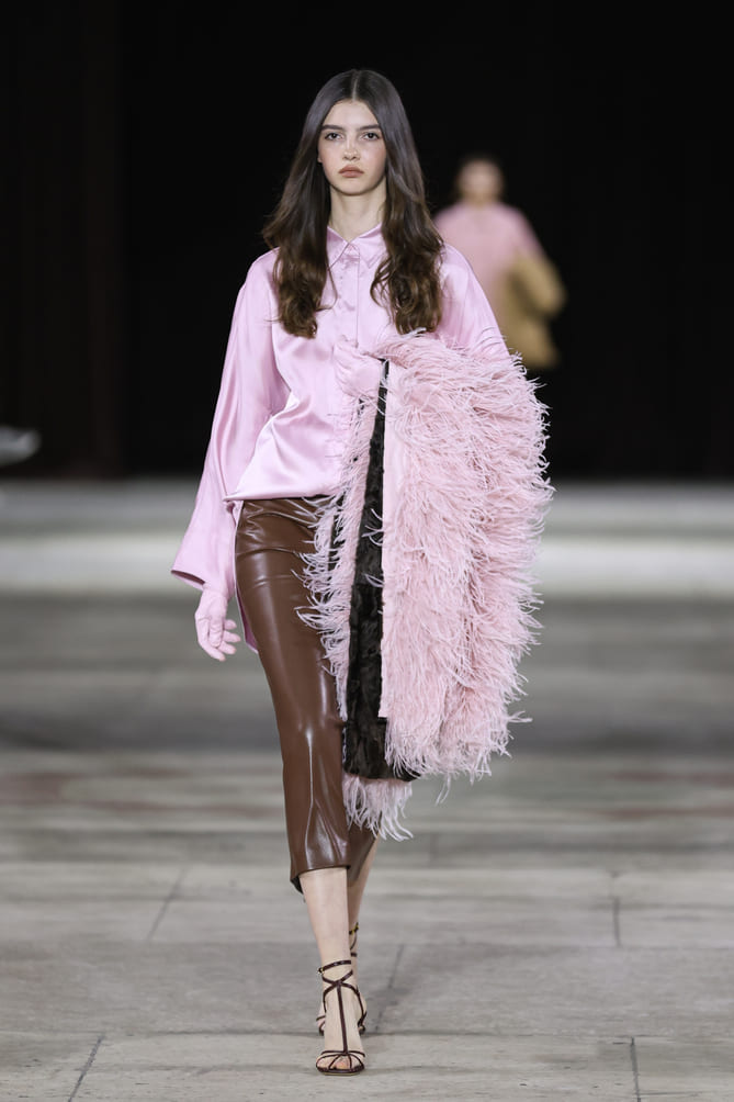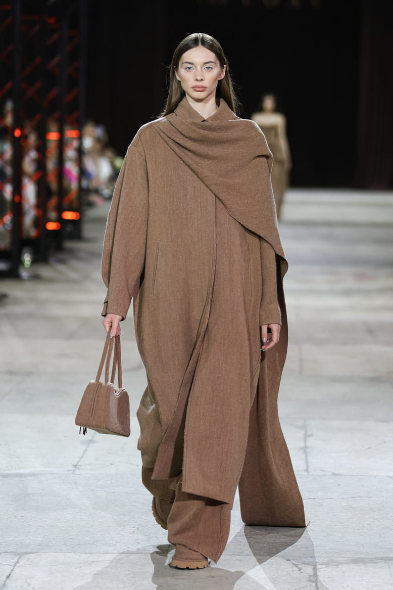 Перші образи на подіумі мали осіннє забарвлення: в шоколадних відтінках створили вільне пальто з шарфом, куртки та піджаки, шкіряну сукню-бюстьє та баски. Після них бренд представив серію бежевих луків та у трендовому пудрово-рожевому й сірому кольорах.