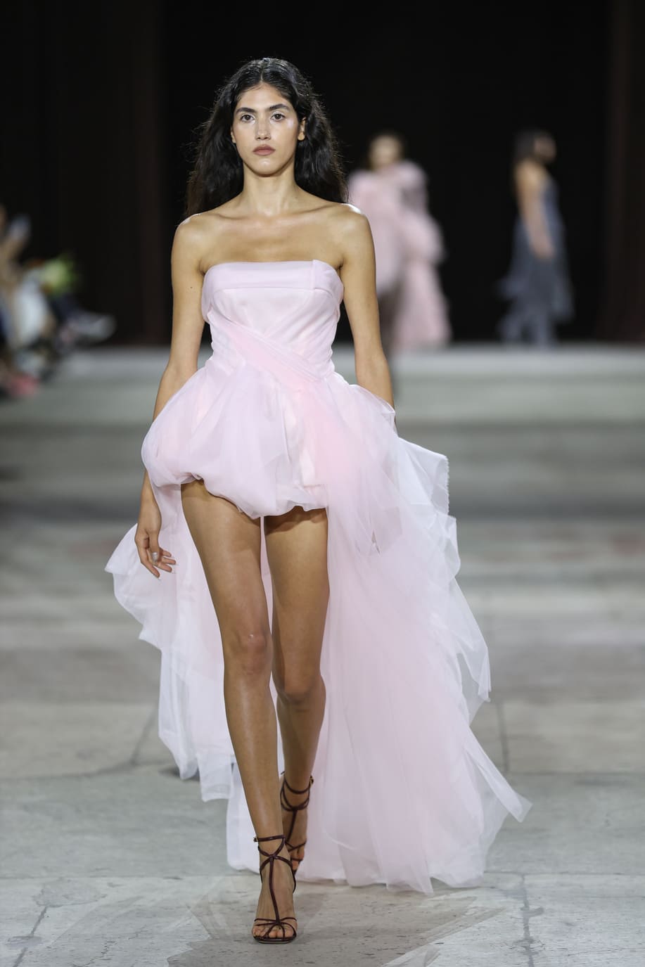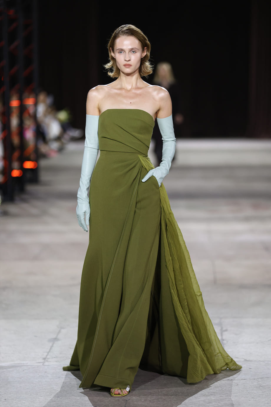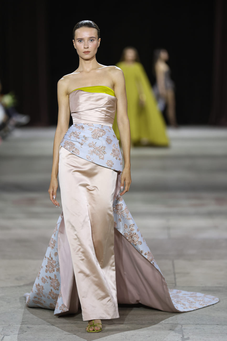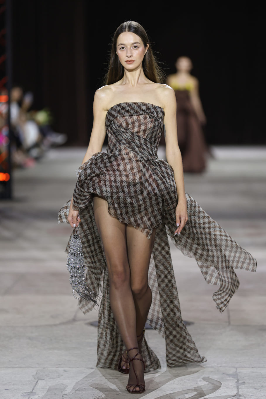 Перші образи на подіумі мали осіннє забарвлення: в шоколадних відтінках створили вільне пальто з шарфом, куртки та піджаки, шкіряну сукню-бюстьє та баски. Після них бренд представив серію бежевих луків та у трендовому пудрово-рожевому й сірому кольорах.