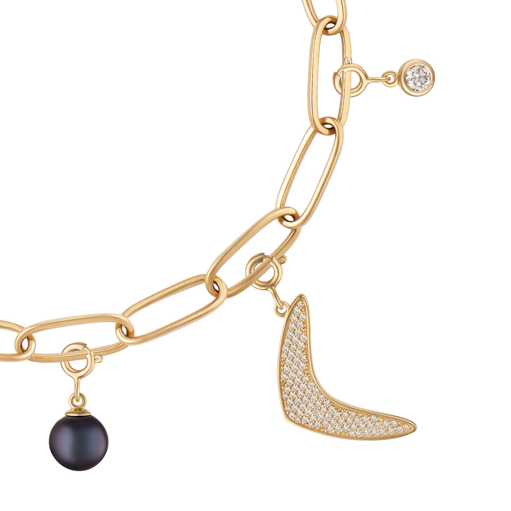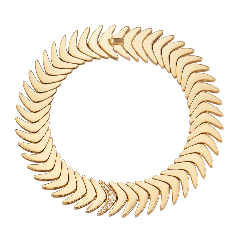 В центрі колекції масивні statement прикраси у вигляді бумеранга як символ циклічності, як в моді, так і в житті. Він про те, що справді твоє завжди повернеться. Зразком високого ювелірного мистецтва став statement браслет у вигляді ланцюга з ланок-бумерангів, кожна ланка має подвійну основу, яка створює об’єм в прикрасі, оздоблений діамантовим розсипом. Ювеліри працюють над кожним браслетом більш ніж 50 годин, виконуючи всі деталі власноруч.