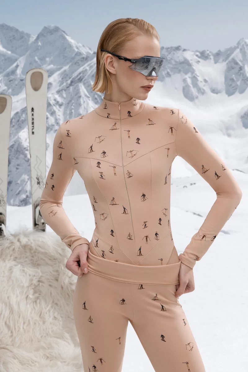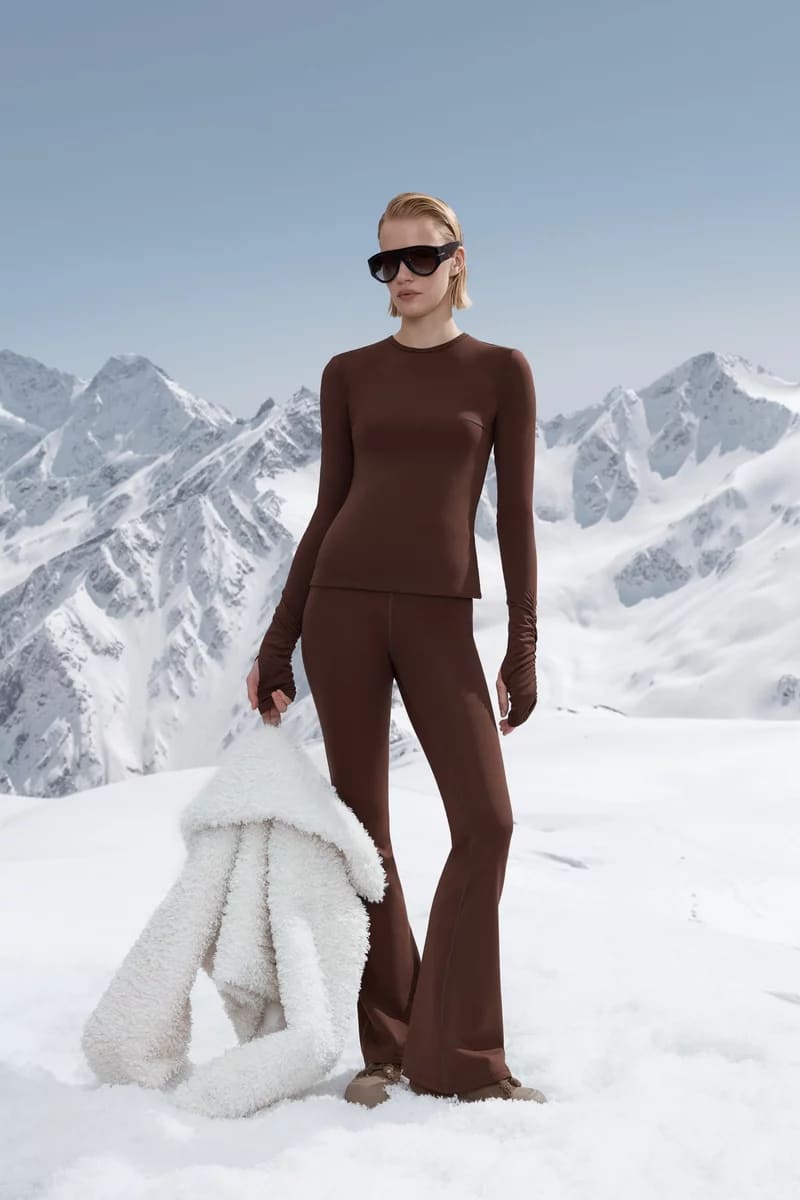 Термолінійка Gepur представлена приталеними моделями, що підійдуть як для активного зимового відпочинку, так і для щоденних багатошарових образів. Серед них — максісукня, легінси-кльош та лонгслів у трендовому шоколадному відтінку, а також бежеве боді з гірськолижним принтом.