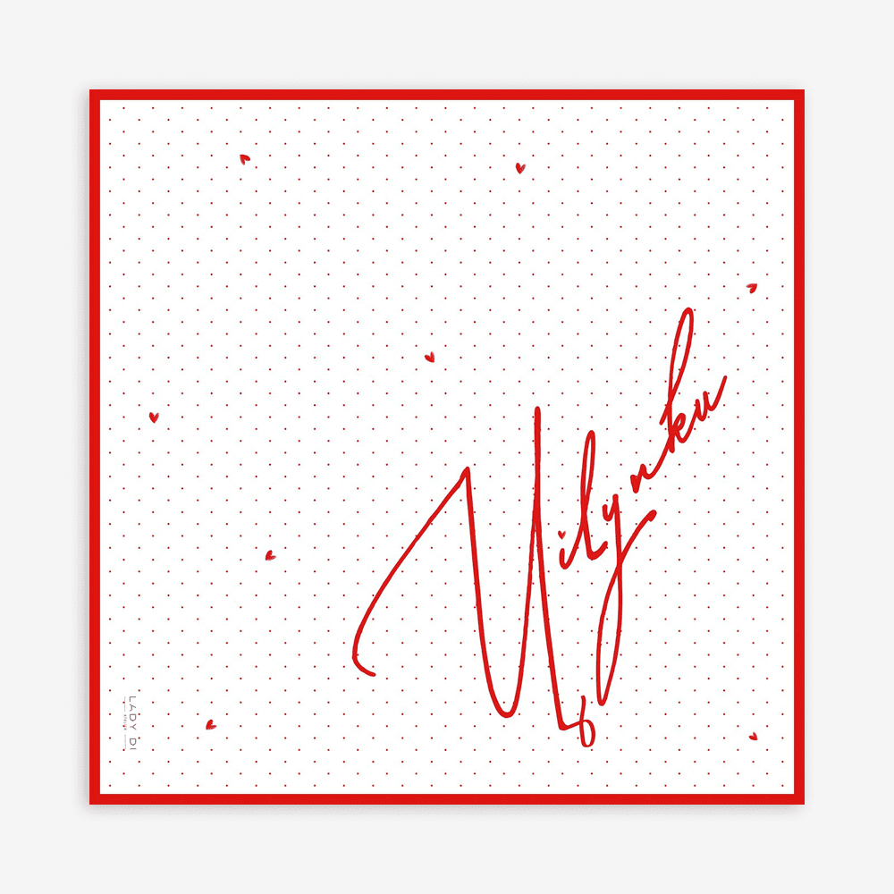 Інша хустка бренду — "Цілунки" — декорована червоним гороховим візерунком на білому тлі. "Часом для того, щоб відчути себе щасливим, достатньо розпалити своє серце приємними спогадами, емоціями, людьми та цілунками", — кажуть у Lady Di atelier про меседж, закладений в цьому виробі.