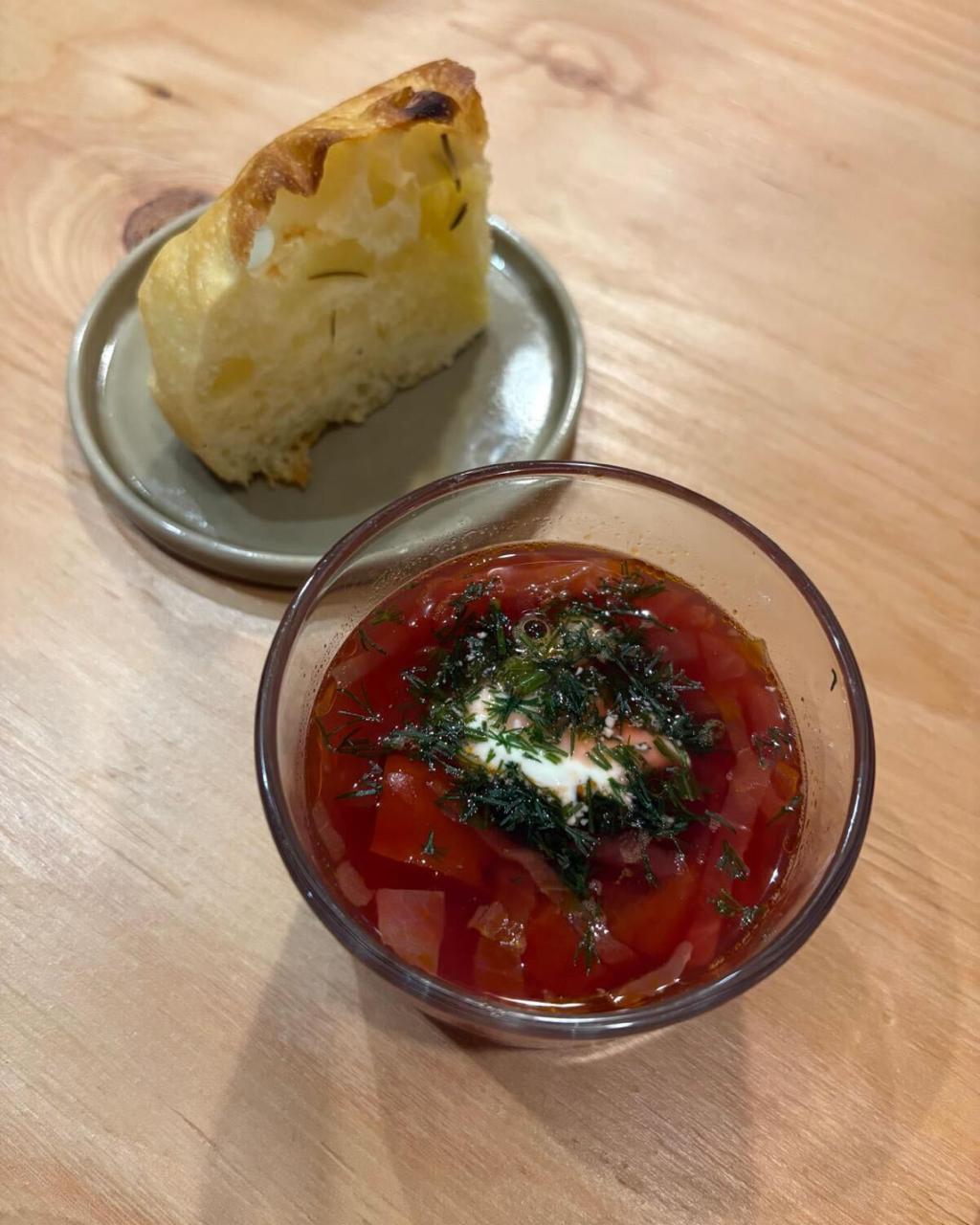 А от чому борщ? У просторі в Дзусі всюди висять українські прапорці, наша продукція й велика карта України, тому борщ став логічним продовженням цієї історії. Ми говоримо про Україну не лише через дизайн, а й через їжу.