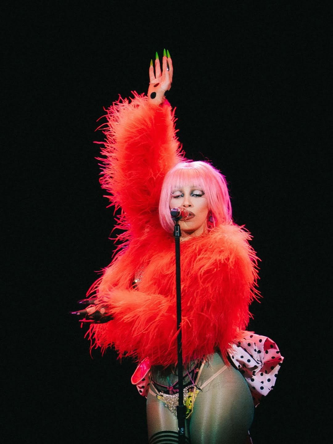 Під час концерту 10 лютого в Сантьяго, столиці Чилі, у межах турне Ma Vie реп-співачка Doja Cat доповнила свій образ яскравим зелено-бежевим сетом білизни Canary Neon від ZHILYOVA.