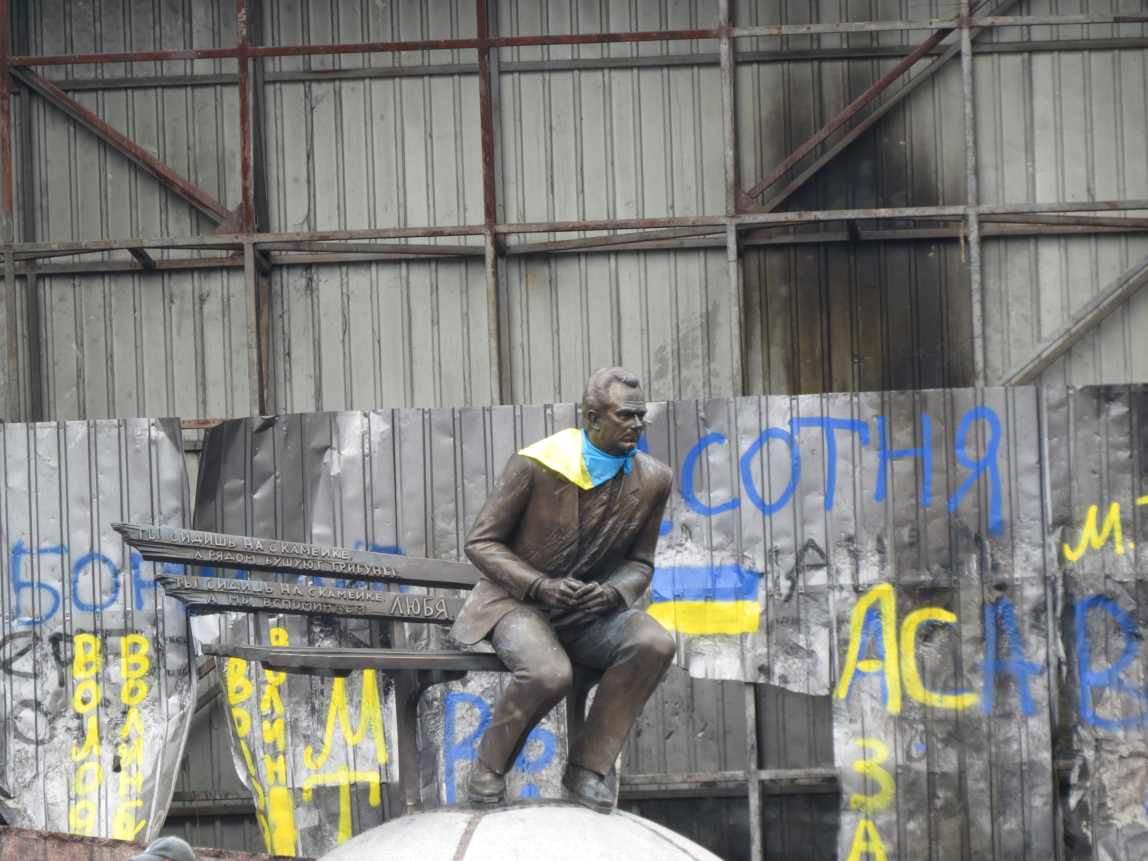 Ну як тут не згадати пам'ятник Валерію Лобановському. Після подій на Майдані, перше, що зробили кияни, — відмили від піни вогнегасників (там все навколо палало) свого улюбленого Тренера. А хтось з небайдужих людей зав'язав на шиї Валерія Васильовича прапор України.