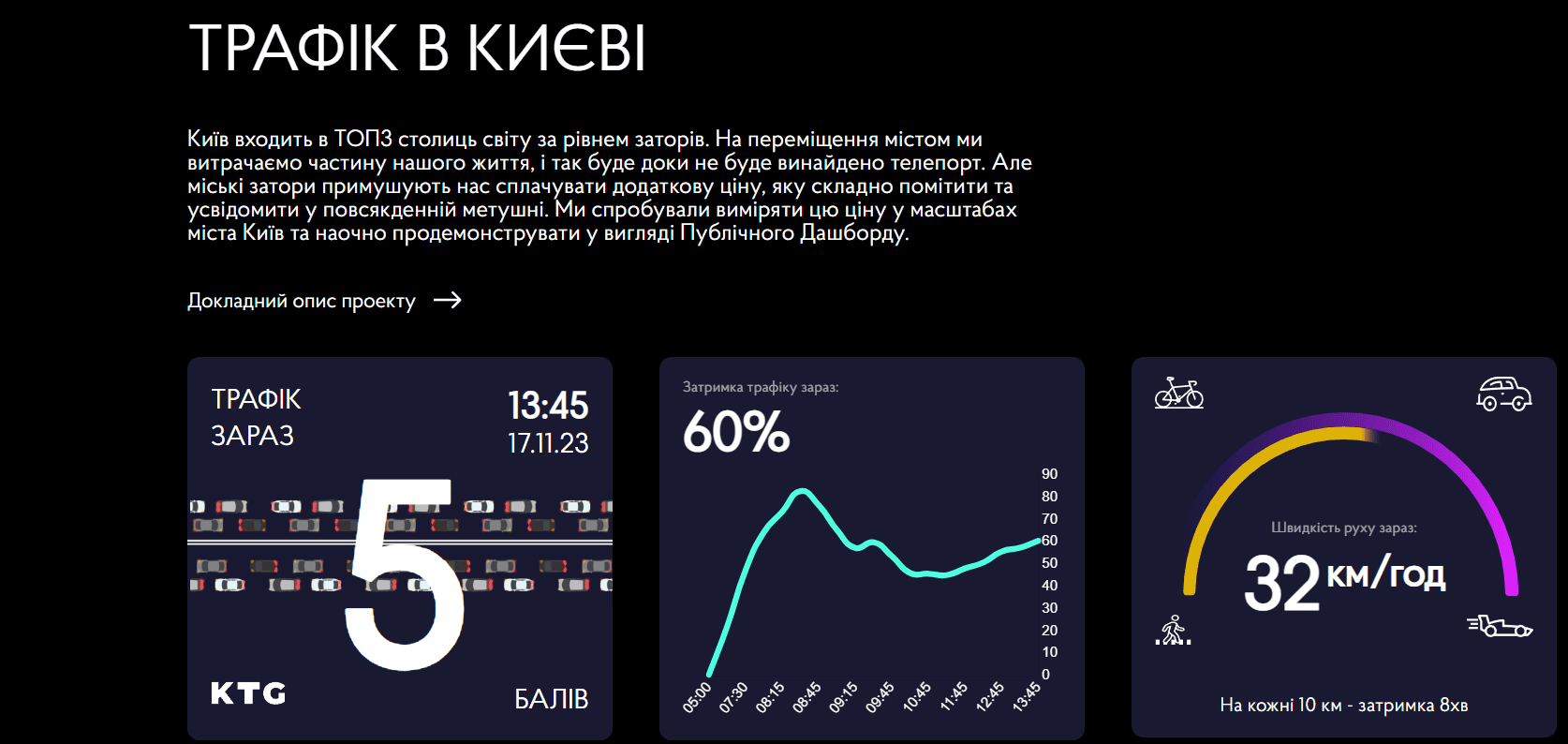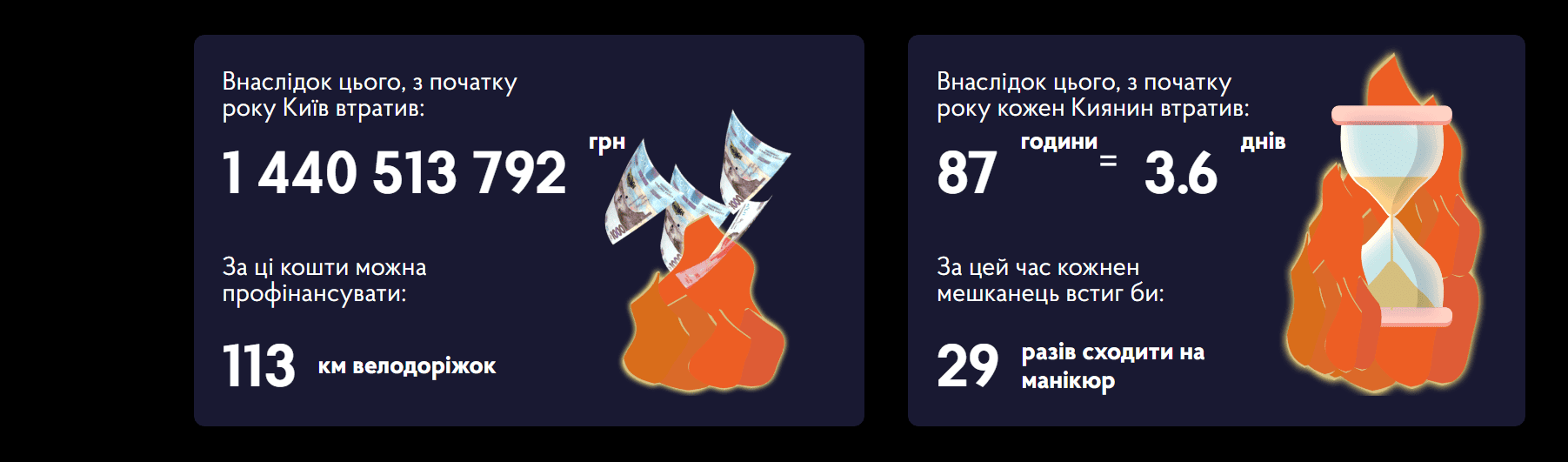 Київ входить у ТОП-3 столиць світу за рівнем заторів. З початку року кожен киянин втратив у них 86 годин, це майже 4 дні. Офіс трансформації перевів час у гроші та дійшов висновку, що за них можна профінансувати 8 дитсадків, на 37% реконструкцію мосту Патона, 13 спорткомплексів, 3 школи, 2 нові лікарні та 23 поліклініки.