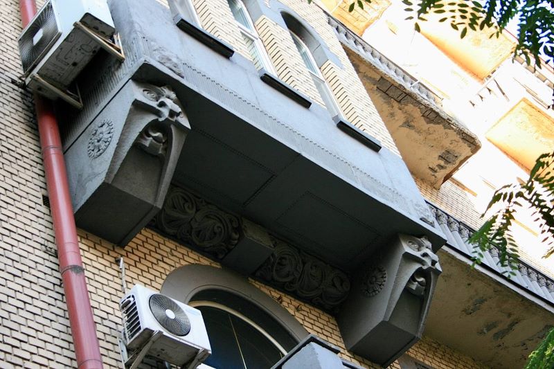 Можливо, перехожим легко впасти в око цій красуні, але нам її було знайти непросто. Адже великий будинок, який наче складається з кількох різних, має на фасаді лише одну таку скульптуру, і ту — нагорі. При цьому він прикрашений іншими дивними елементами: від голів звірів, схожих на левів, до схематичних, фантазійних, геометричних.