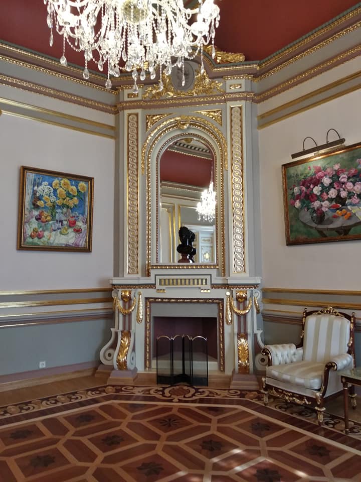 До речі, з автентичних інтер'єрів палацу майже нічого не збереглося — вельми буремні були часи. Лише в одній з кімнат — медальйони з пухлими купідончиками.