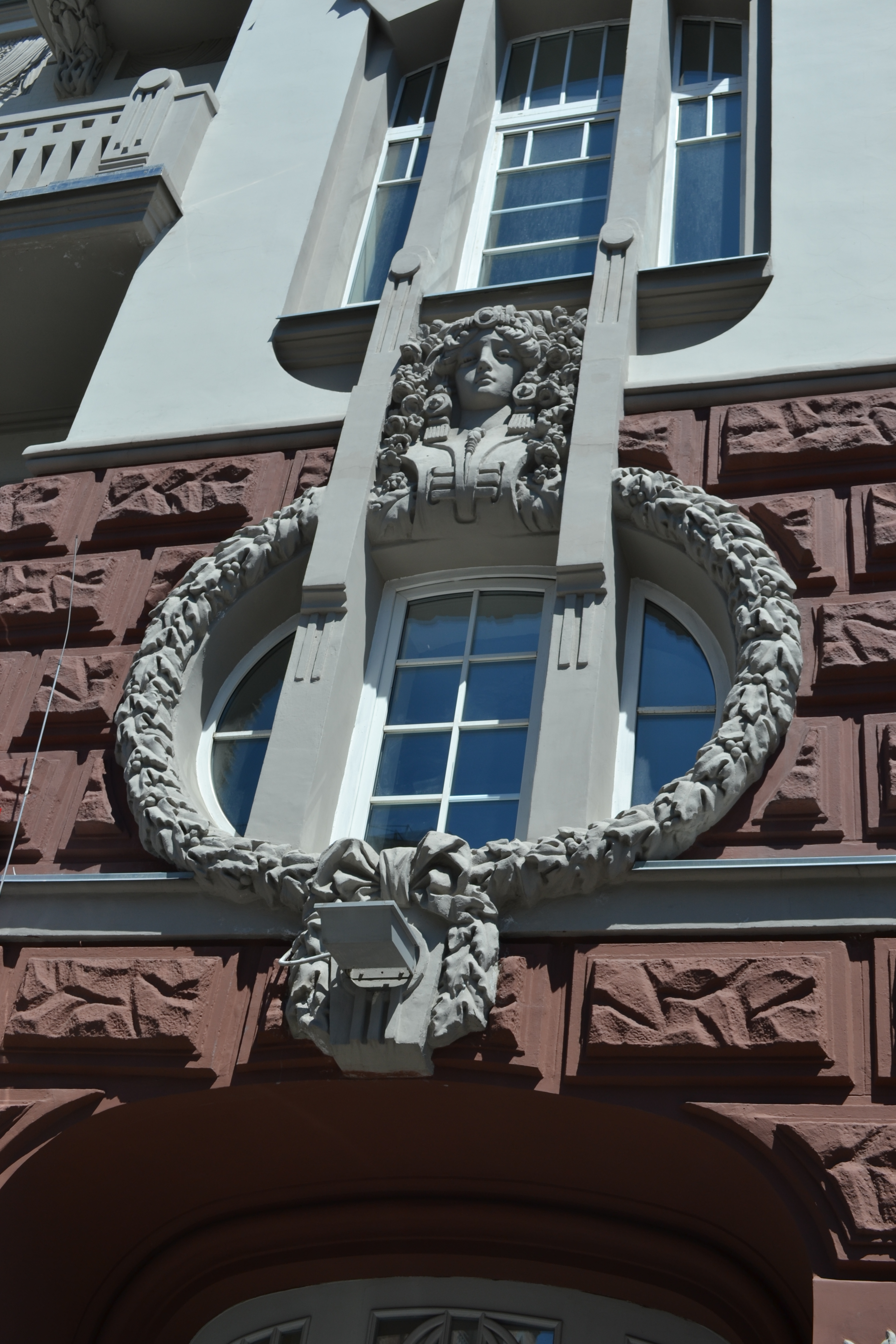 На цьому ж будинку також "прописані" чоловічі маскарони (суворі такі бородані) — вони охороняють вікна, та жіночий — у фронтоні. Чоловіків хоч і більше, проте жінка — головна (бо в центрі). Тож гендерну рівність дотримано.
