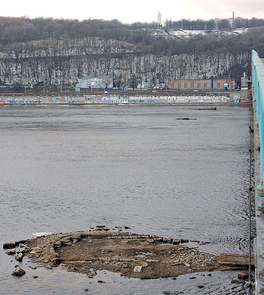 Коли рівень води знижується, то навіть сьогодні можна побачити залишки опор мосту.