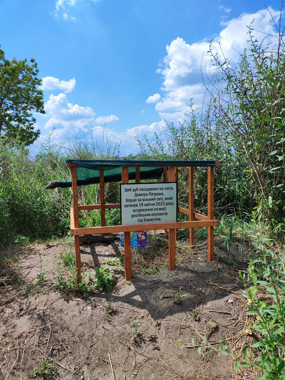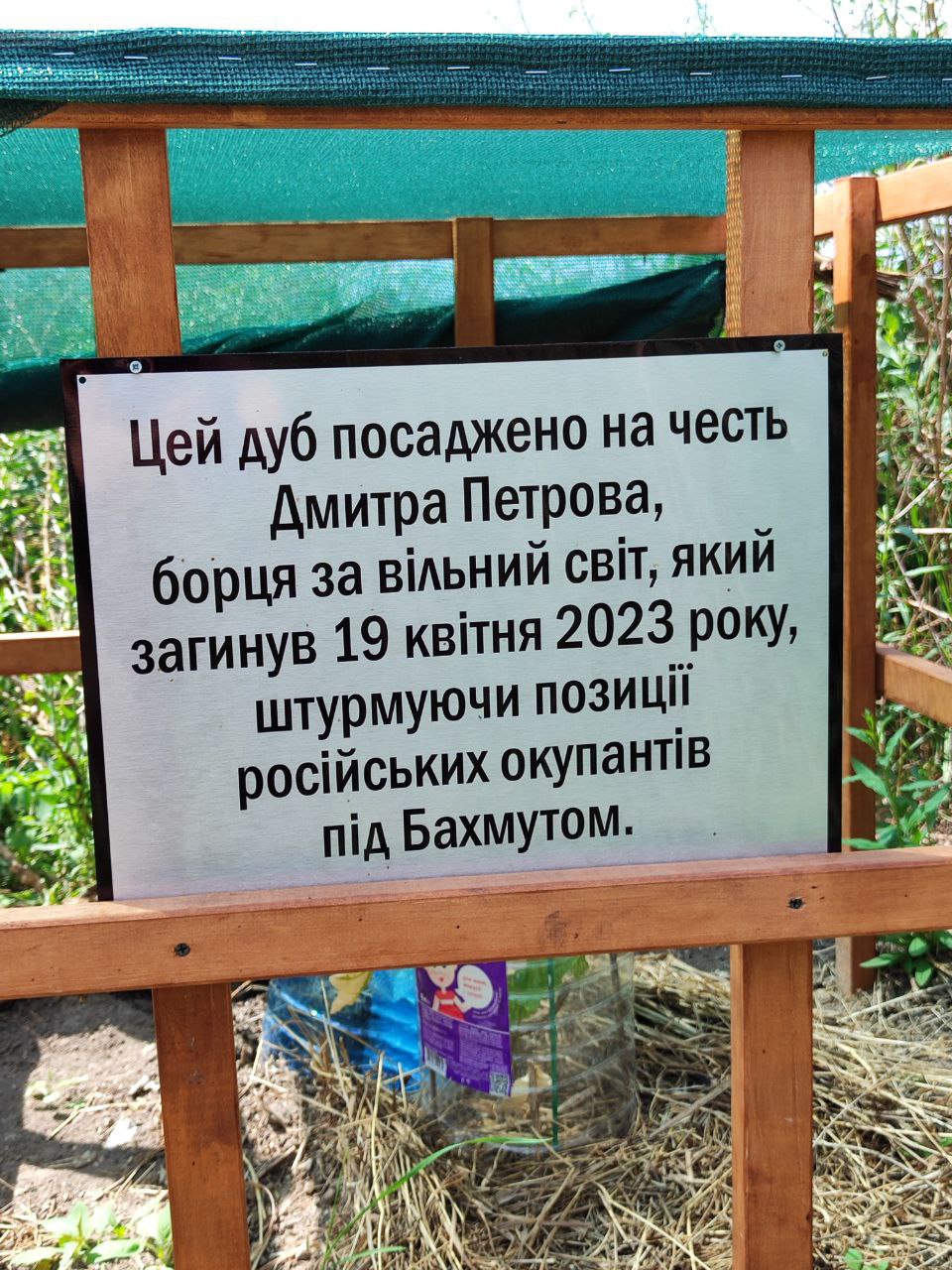 Якщо пройтися двориками та протиснутися у щілину поміж гаражів, то можна вийти на схил Щекавиці. І побачити там дещо зворушливе: молодий дубок, посаджений на честь Дмитра Петрова — українського воїна, що загинув під Бахмутом. Хай зростає…