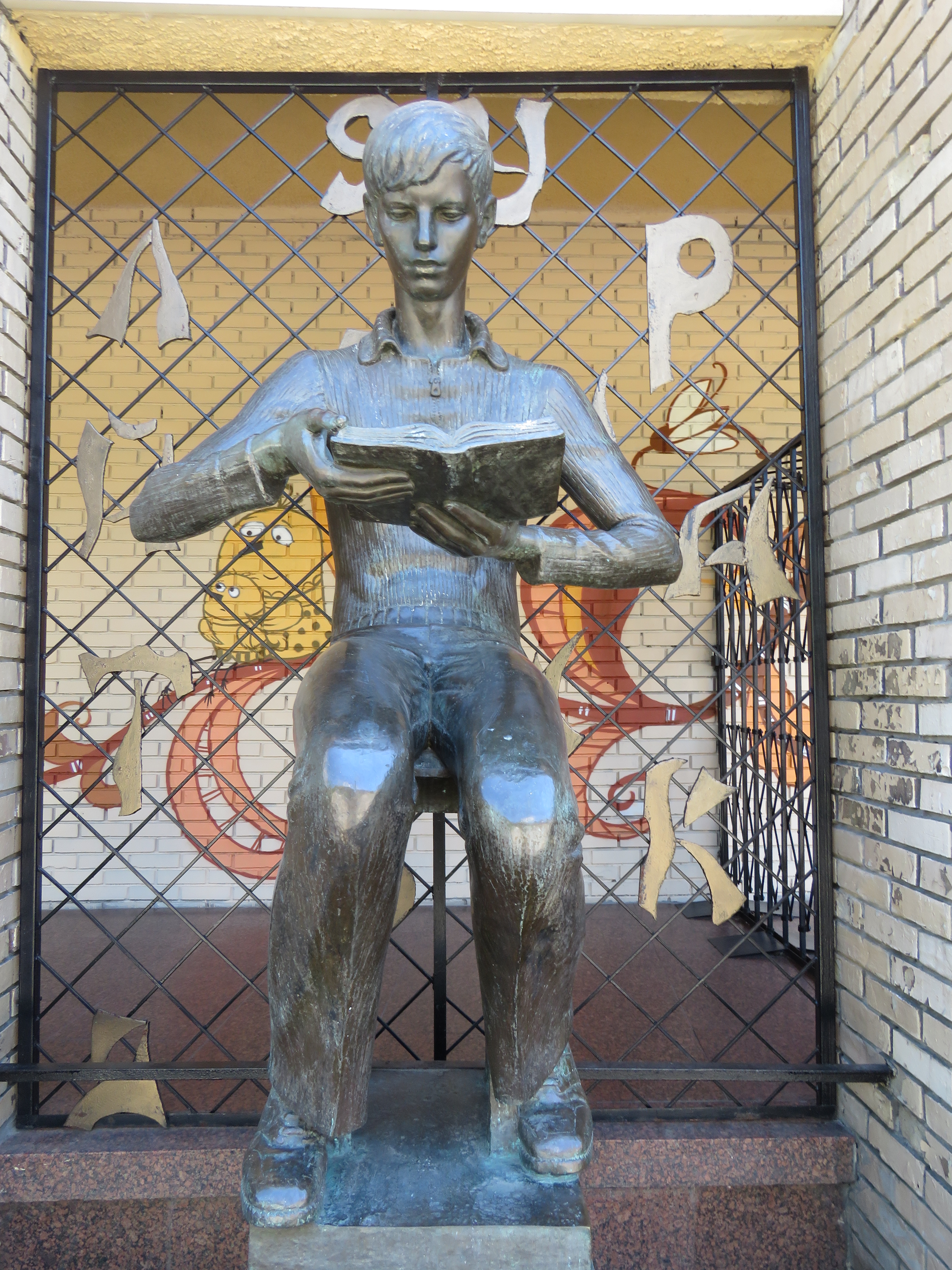 Вхід до бібліотеки "охороняє" юнак з книгою. Цю чудову скульптуру зробив справжній маг від скульптури — Борис Довгань. Ще років із п'ять тому хлопчик перебував... за ґратами. Саме в такий спосіб його рятували від вандалів. Але пізніше решітку таки прибрали.