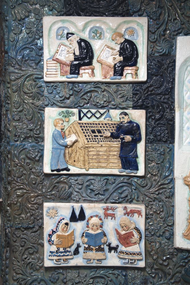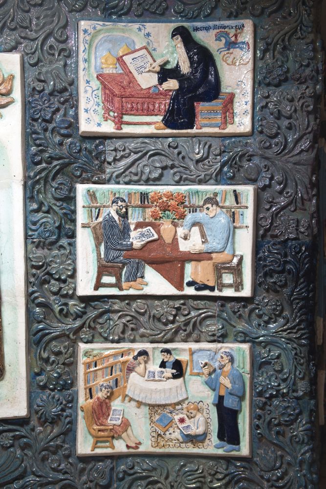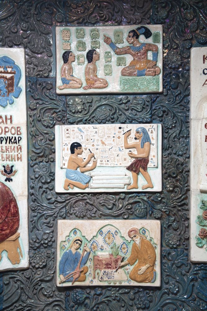 Але це тільки початок. Найголовніше — на другому поверсі: панно "Першодрукарі", яке розповідає історію писемності (від єгиптян і Київської Русі до сьогодення).