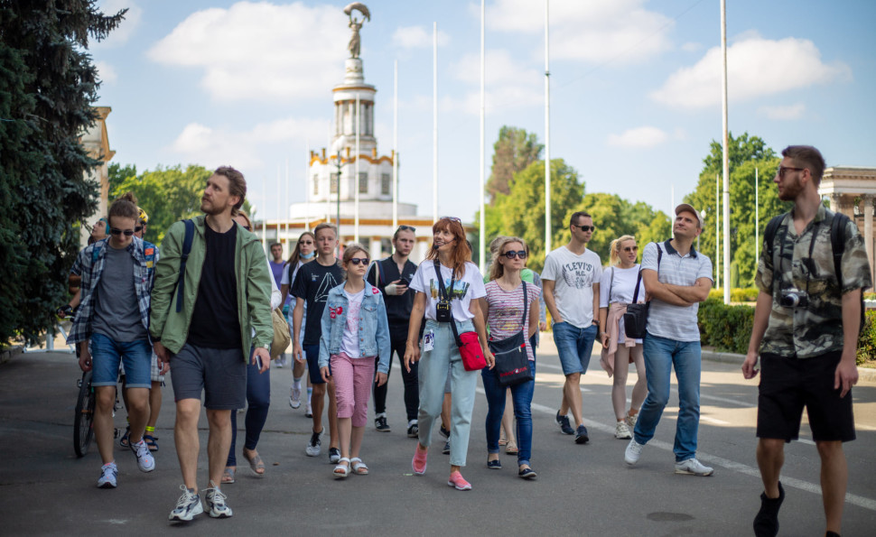 Ти розпочнеш мандрівку центральною площею ВДНГ, розглядаючи зображення на павільйонах, і довідаєшся, чому на них досі збереглася радянська символіка. Почуєш легенди й маловідомі історії про цю локацію, з'ясуєш, у якому павільйоні демонстрували алкогольні напої, а в якому — справжню ковбасу. А ще дізнаєшся, з чого виготовлено 9-метрову скульптуру жниці, що вінчає павільйон №10, — і це ще не все!