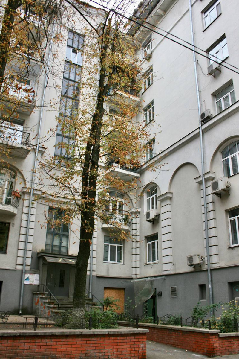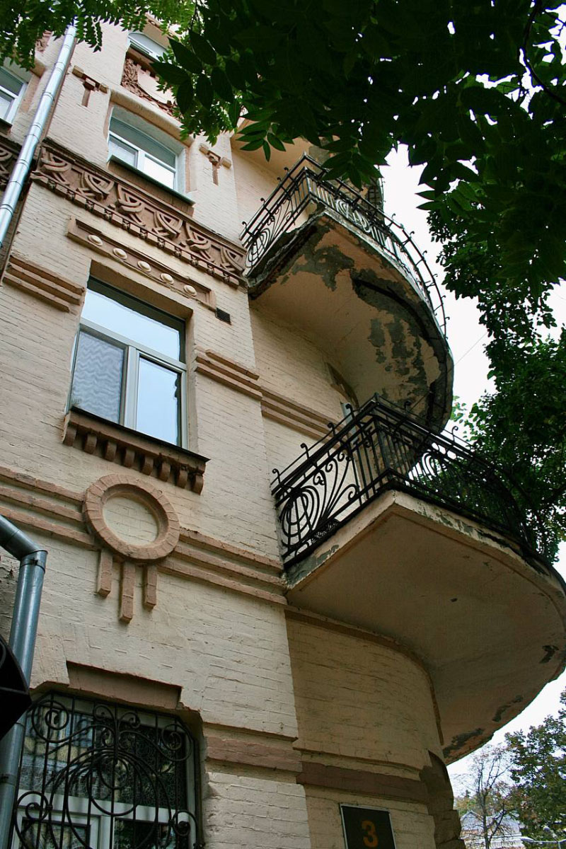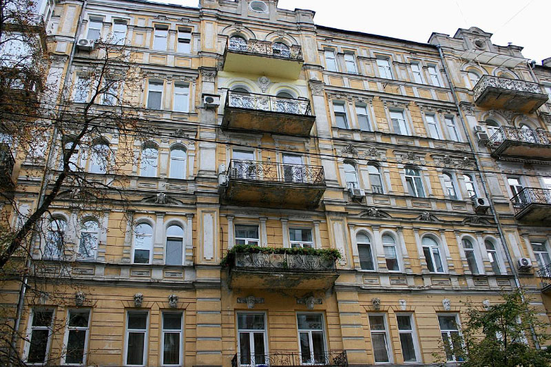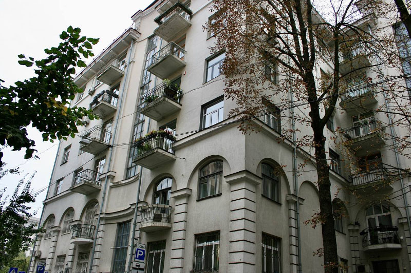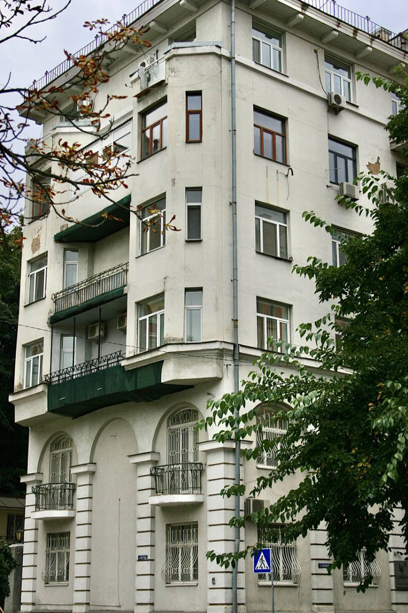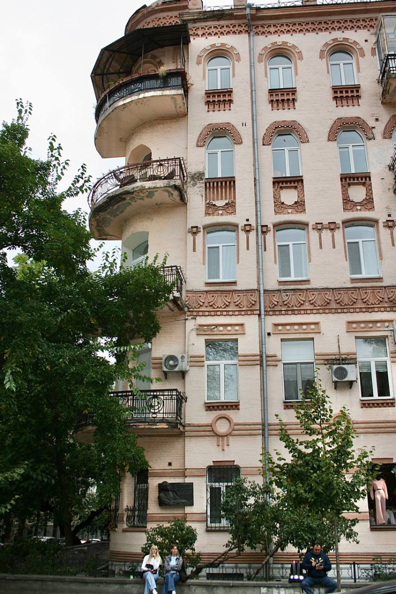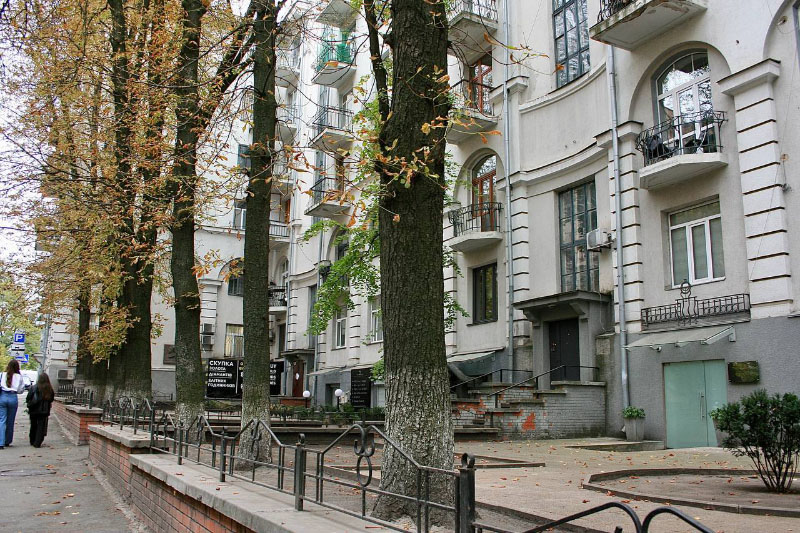 Цей довгий будинок сірого кольору пролягає всією парною частиною коротенької вулиці. Перед ним є класичний палісадник в дусі київських Липок. Будівля стриманого вигляду не надто виділяється фігурним оздобленням, але притягує погляд охайною геометрією. А ще — двома меморіальними дошками.