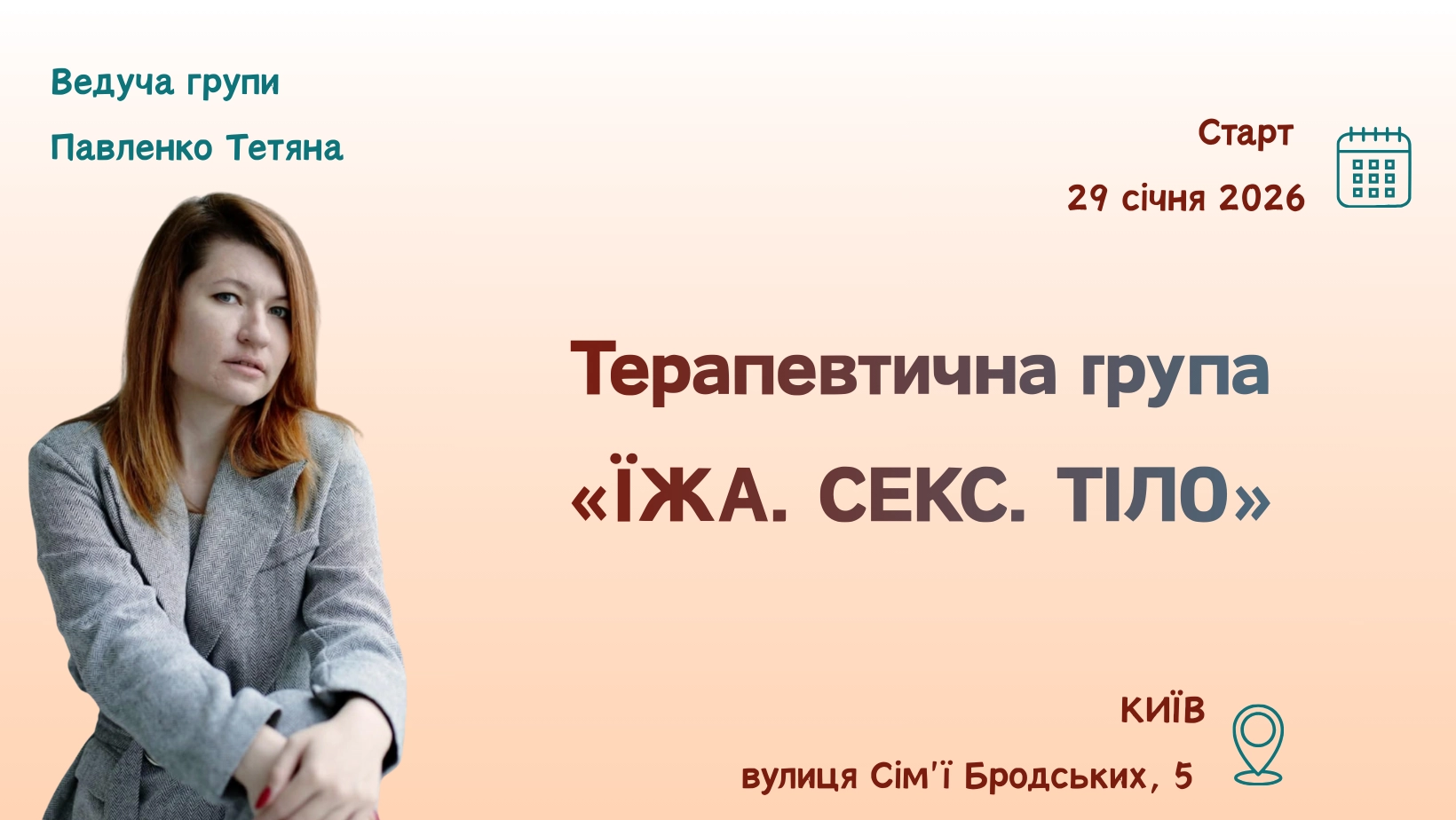 У групі передбачена робота з тілом, психосоматикою, харчовою поведінкою та сексуальністю. Ведуча — психологиня, сексологиня й сімейна коучка Тетяна Павленко.